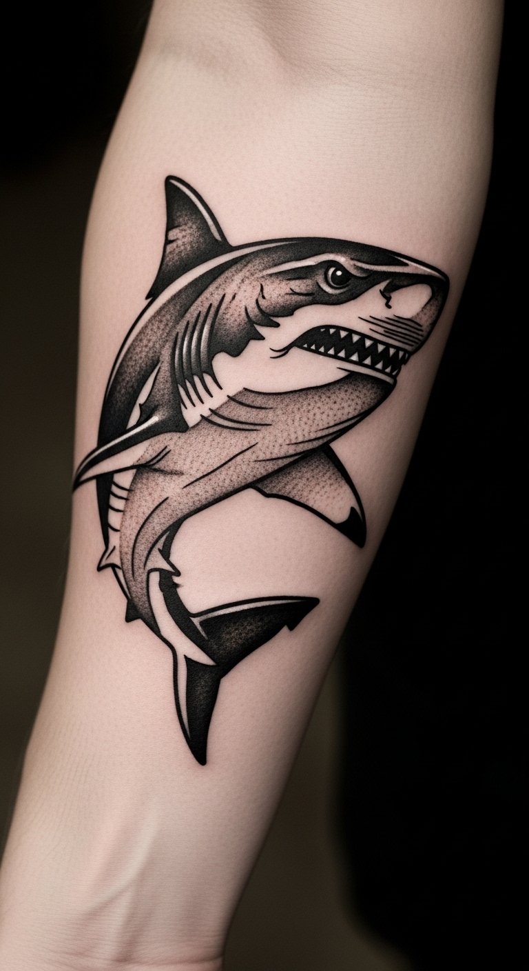Dive into the classic blackwork shark for timeless appeal. This design uses solid black ink to highlight the shark’s power. Start with a simple sketch on paper. Grab a pen and draw a basic shark shape. Keep lines thick and bold. For a budget option, use free online templates to trace at home. Bold black ink works well on larger areas like arms. Think about placement—arms show off the design easily. Add personal touches, like waves around it, using affordable markers for your mock-up. Once ready, visit a local tattoo shop for quotes; many offer deals under $100 for small pieces. Practice aftercare with basic lotions from your medicine cabinet. This style lasts years with simple care, like daily moisturizing. Go for it to show your fierce spirit without breaking the bank.