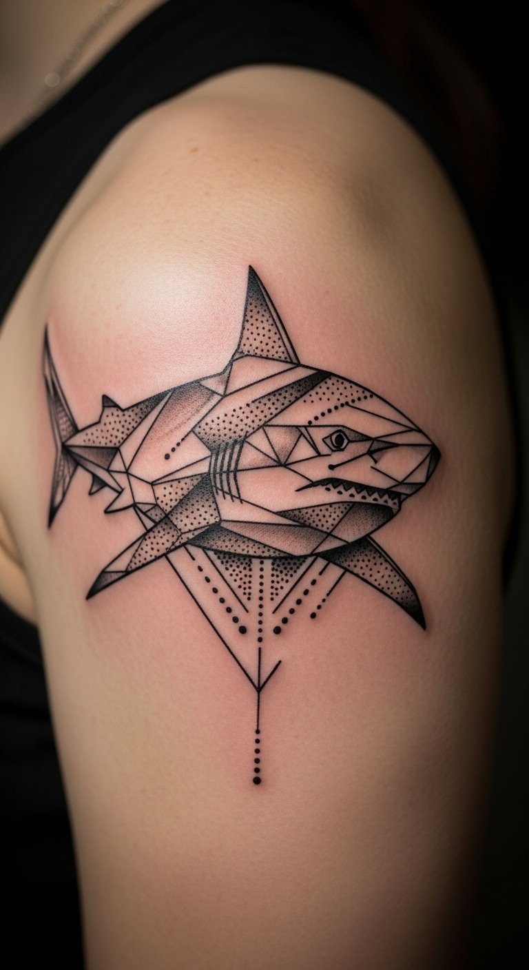 Explore geometric shark patterns for a modern twist. Shapes like triangles form the shark’s body, adding an artistic edge. Draw a grid on paper first. Use a ruler for straight lines. Keep it simple—start with basic forms. For DIY fun, print geometric stencils online and trace them. Geometric shark tattoo fits sleeves or backs perfectly. Pick spots that flow with your body curves. Add dots with a fine-tip pen for extra detail. Budget tip: Look for artist specials on platforms like Instagram; some charge less for smaller designs. Test ideas with temporary tattoos from dollar stores. Maintain it with gentle soap and water daily. This approach lets you personalize easily, blending strength with style on a dime.