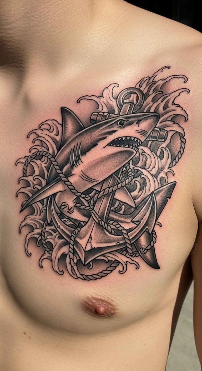 Try a nautical shark with anchors for ocean vibes. Combine the shark with anchors and waves for added depth. Sketch it out on notebook paper. Draw the shark first, then add anchor details. Keep drawings straightforward. Use free apps for digital mock-ups on your phone. Nautical shark tattoo shines on chests or legs. Choose areas that match your daily wear. Include simple waves with curved lines. Save money by consulting affordable artists at local fairs. Get temporary versions from craft stores to test. Care involves basic bandaging and lotions you already own. This design tells a story of adventure without high costs, making it easy to adapt.