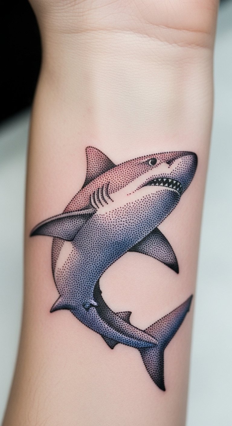 Consider dotwork shark for subtle power. Dots build the shark’s shape, layer by layer. Start with dot practice on scrap paper. Use a pen for small circles. Build up slowly. Dotwork shark tattoo suits wrists or ankles nicely. Pick areas that hide or show as you like. Experiment with patterns using household items. Find deals with independent artists online. Try stick-on versions first. Keep it simple with regular cleaning routines. This method offers a personal touch at low cost, helping you express resilience easily.