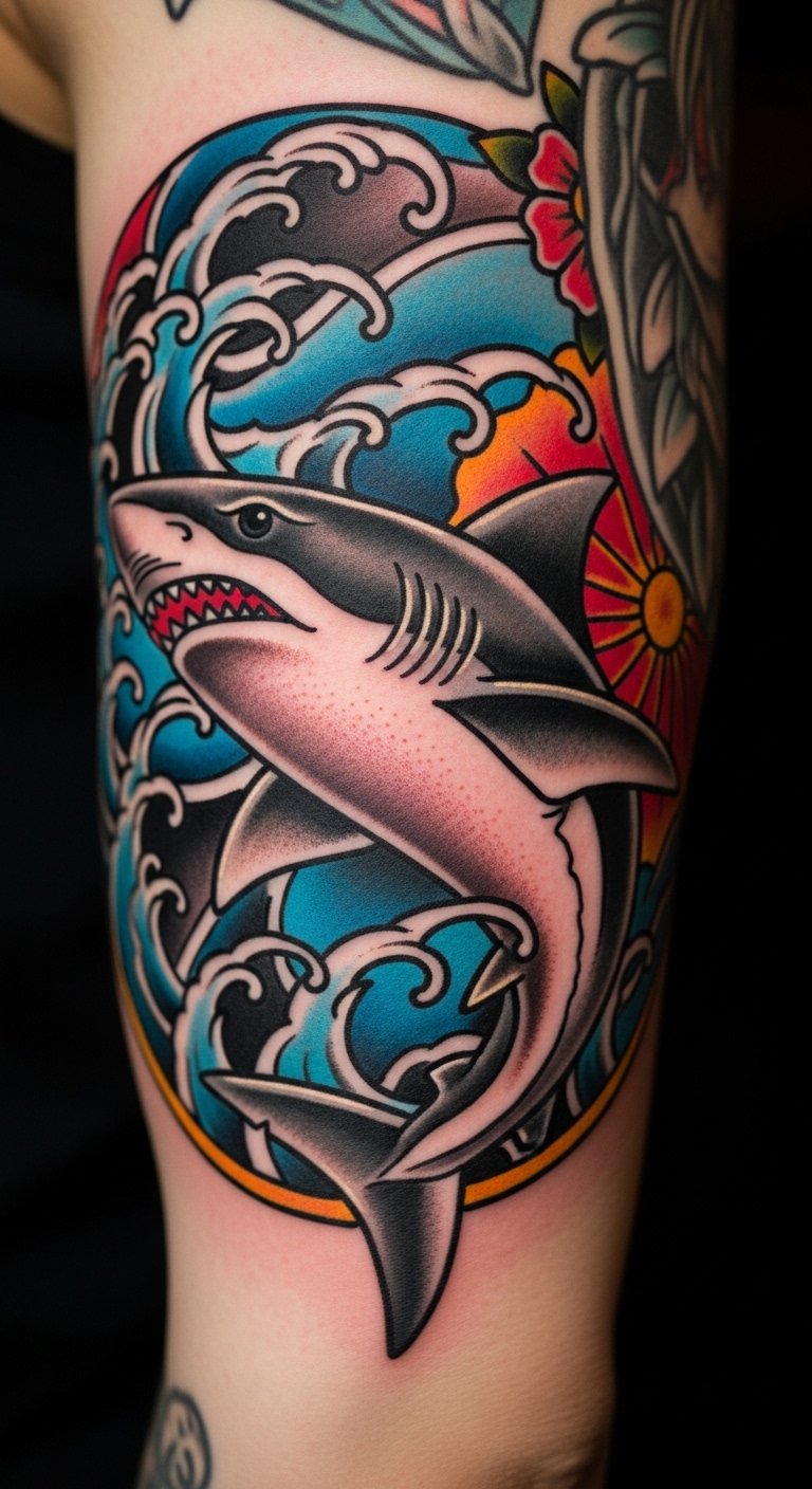 Opt for traditional shark with waves for vintage flair. Use bold lines and wave patterns around the shark. Draw bold outlines on plain paper. Add waves with wavy lines. Keep it classic. Traditional shark tattoo looks sharp on biceps. Choose spots that flex with you. Personalize with extra elements like stars. Search for budget artists in your area. Practice with freehand drawings at home. Use basic salves for care. This design brings history to life affordably, making it a smart pick.