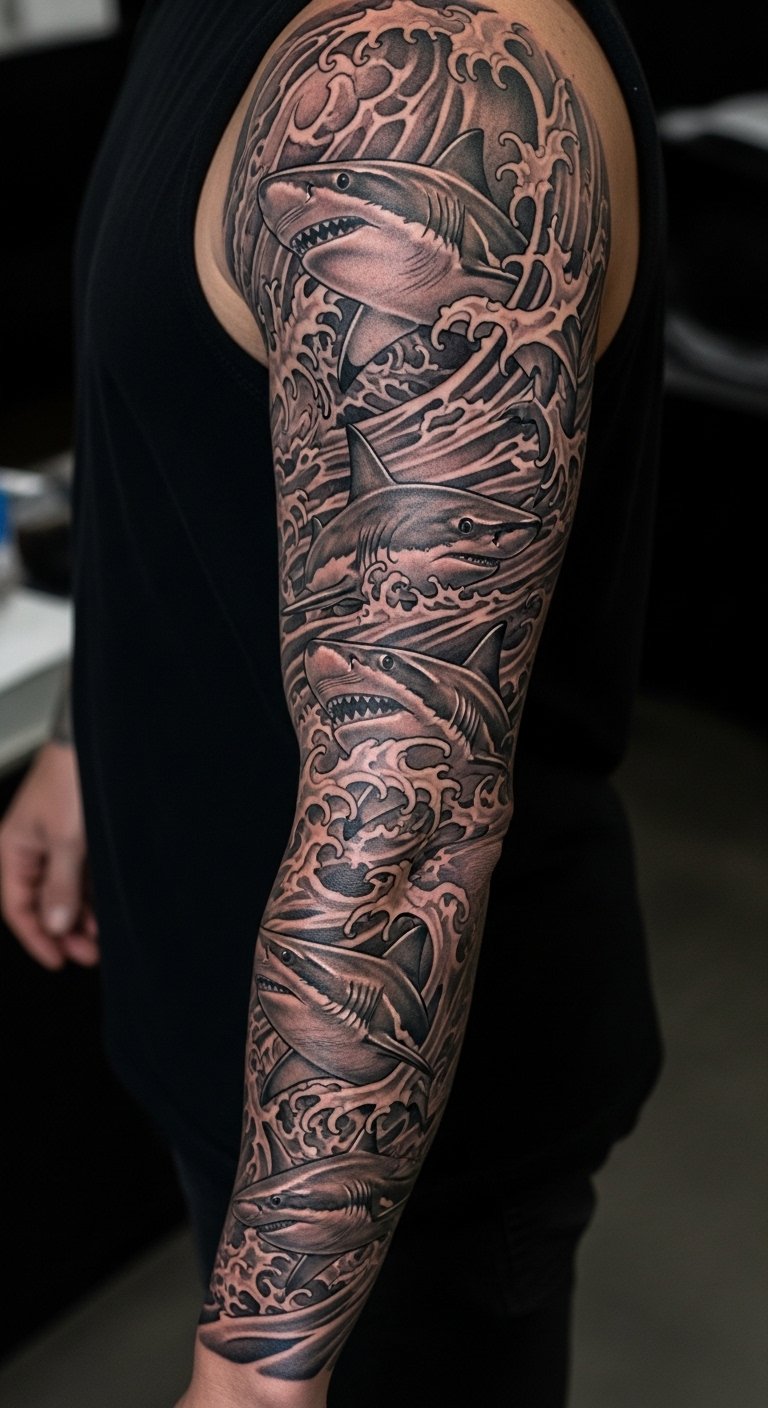 Build a full shark sleeve design for maximum impact. Layer sharks and elements along the arm. Plan on grid paper first. Break it into sections. Start small. Shark tattoo sleeve covers arms fully. Think about daily visibility. Customize with personal symbols. Find phased pricing from artists. Use body paint for trials. Care involves consistent moisturizing. This approach creates a epic story piece by piece, on a budget.