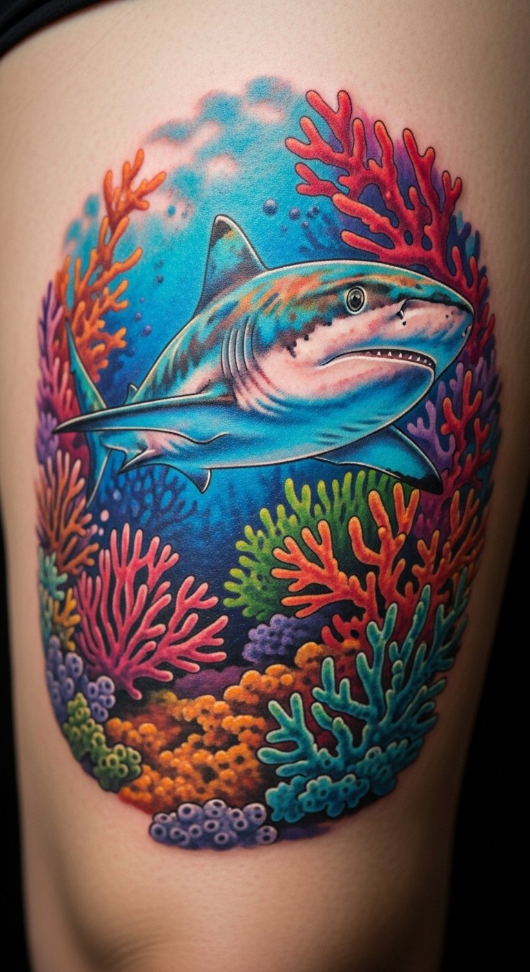 Go with a colorful reef shark tattoo for vibrancy. Use colors to mimic ocean life. Color in your sketches. Pick bright hues. Fun process. Colorful shark design suits thighs. Select areas for color pop. Mix in coral details. Look for color specials. Practice with colored pencils. Use sunscreen for protection. This style adds life affordably, through easy steps.