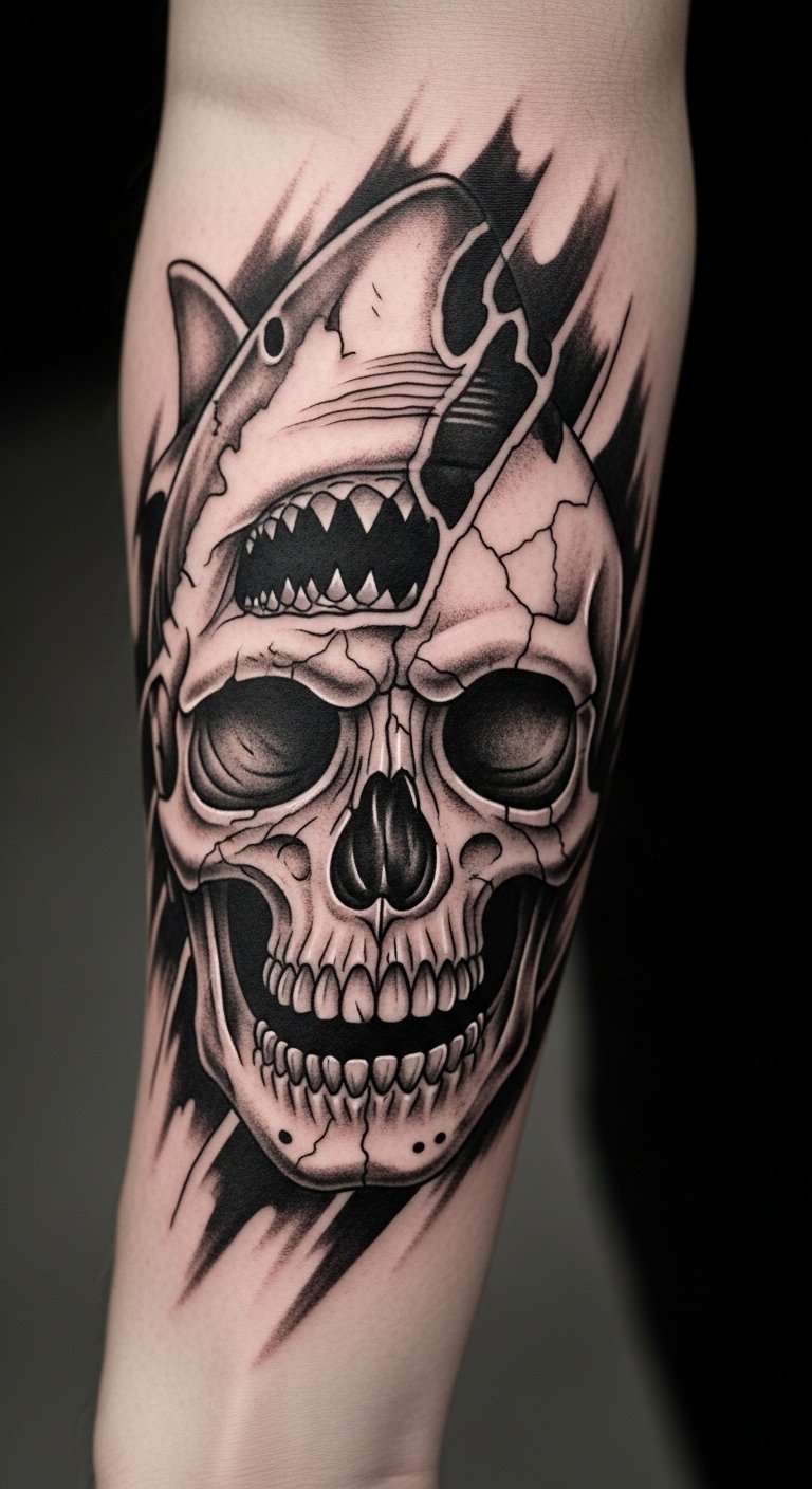 Combine shark and skull for edgy fusion. Place them side by side. Sketch both together. Add connections. Straightforward. Shark and skull tattoo on forearms stands out. Pick visible spots. Blend elements creatively. Check for combo deals. Try drawings first. Basic aftercare works. This mix tells a strong tale economically.