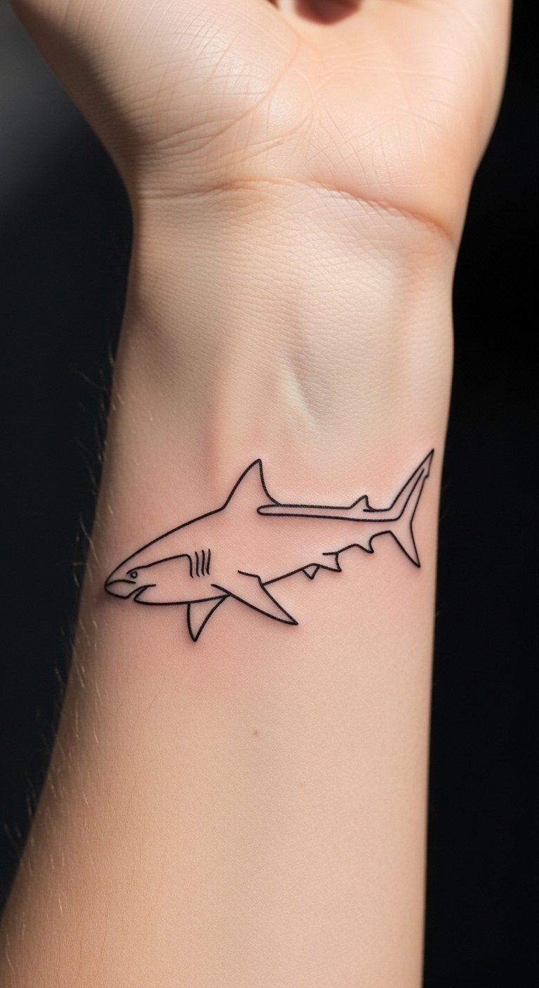 Go with line art shark for basics. Single lines create the form. Quick sketches work. Focus on accuracy. Simple. Line art shark tattoo on wrists is neat. Select easy spots. Keep it plain. Find fast artists. Use pens for tests. Soap and water suffice. This design starts simple and budget-friendly.
