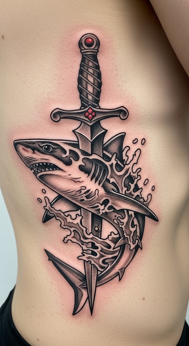 Add shark with dagger element for intensity. Place dagger near shark. Draw them linked. Add drama. Effective. Shark with dagger tattoo on sides works. Choose impactful spots. Mix in details. Find element combos. Practice linking. Lotion maintains. This fusion adds edge economically.