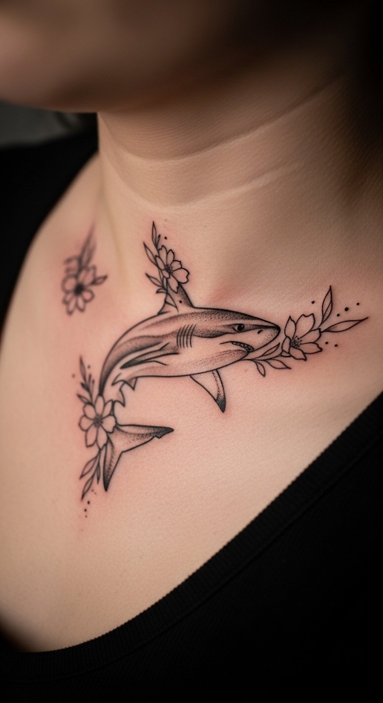 Select feminine shark design for grace. Add flowers or curves. Sketch softly. Blend elements. Pretty. Feminine shark tattoo on collarbones suits. Choose elegant spots. Personalize with flair. Find design options. Practice drawings. Gentle care works. This style empowers affordably.