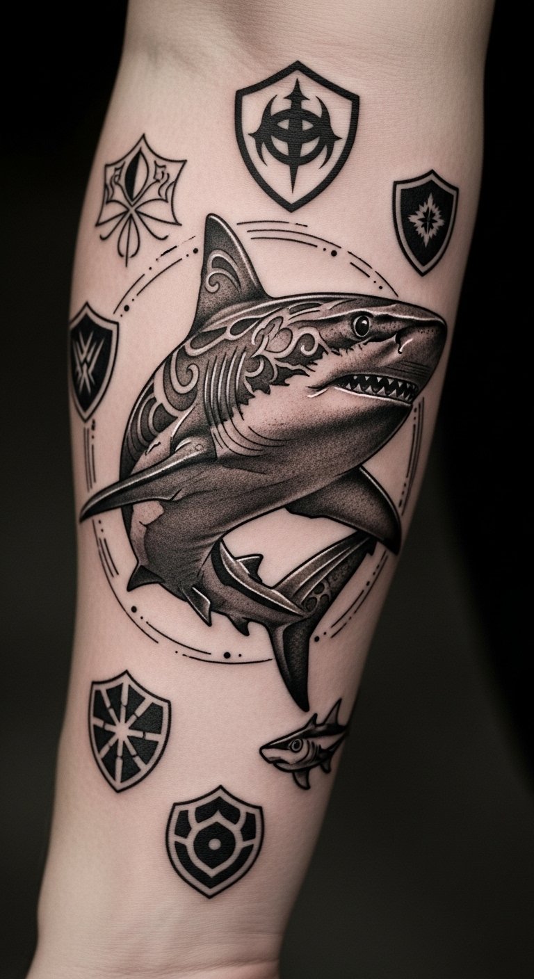 Use shark as guardian symbol for protection. Surround with shield-like elements. Draw symbolically. Add meaning. Personal. Shark guardian tattoo on forearms guards. Pick meaningful areas. Customize symbols. Seek symbol artists. Test ideas. Basic routines help. This design protects your story cheaply.