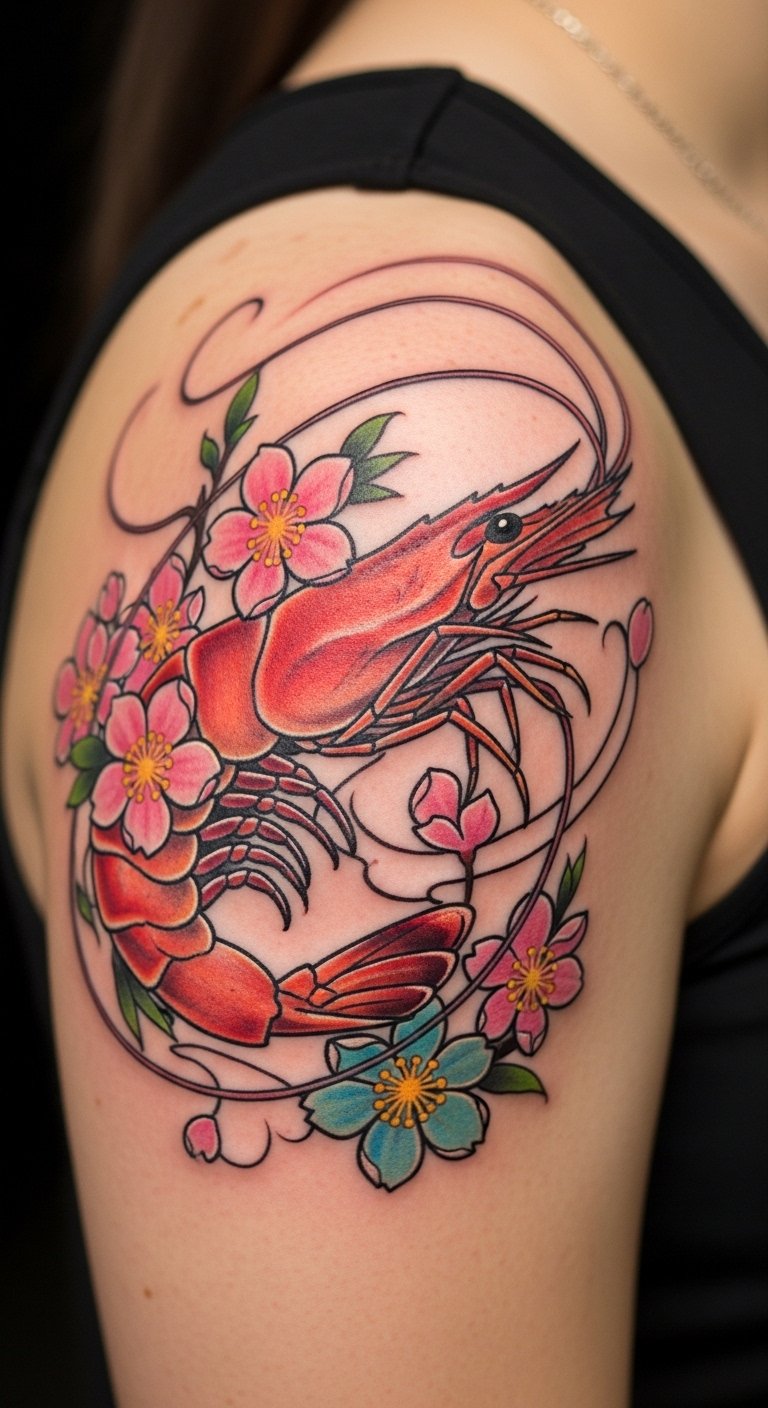 Blend nature’s beauty. A shrimp and flower tattoo combines elements for balance. Put it on your shoulder blade. Draw ideas at home with watercolors. It sparks creativity without expense. Use fabric markers on a shirt for a mock-up, costing $5. This design shows growth and beauty. A session might run $90. Add your favorite flower for flair.