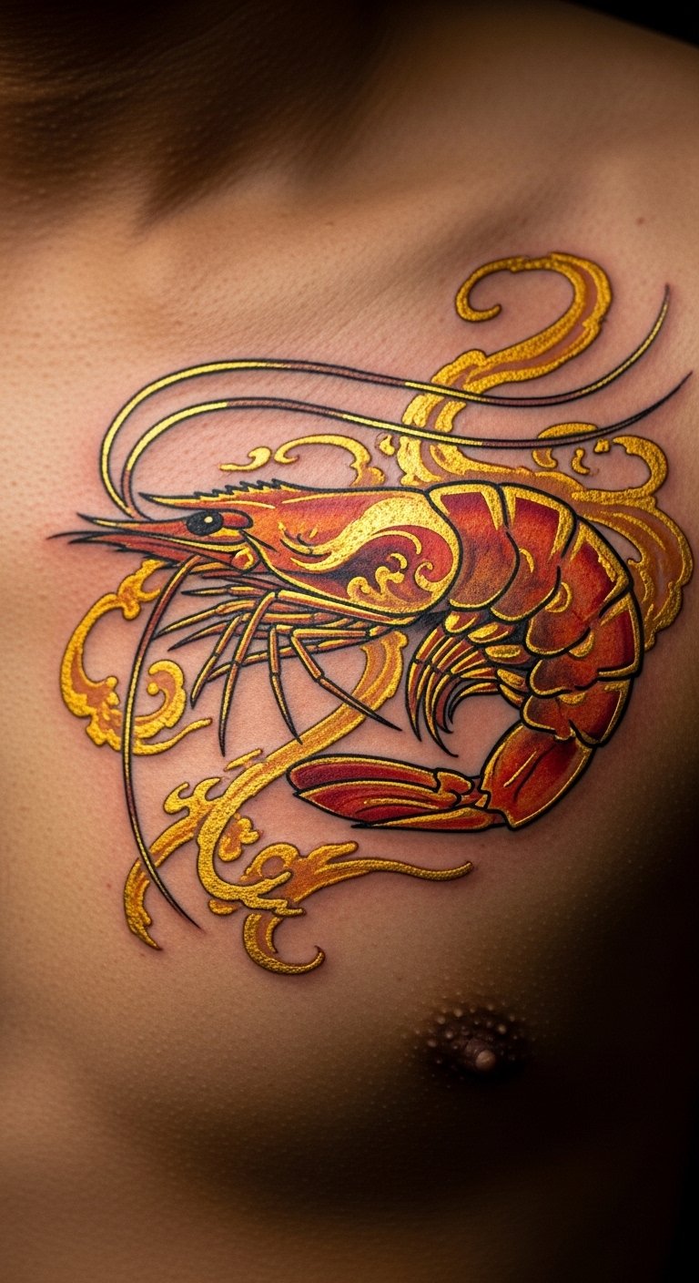Invite good vibes. A prosperity shrimp tattoo uses symbols for luck. Try your chest for meaning. Draw abundance motifs at home with markers. It costs little and inspires. Use gold leaf on paper for ideas, under $10. This ties to cultural fortune. Get it inked for $100. Make it a personal ritual.