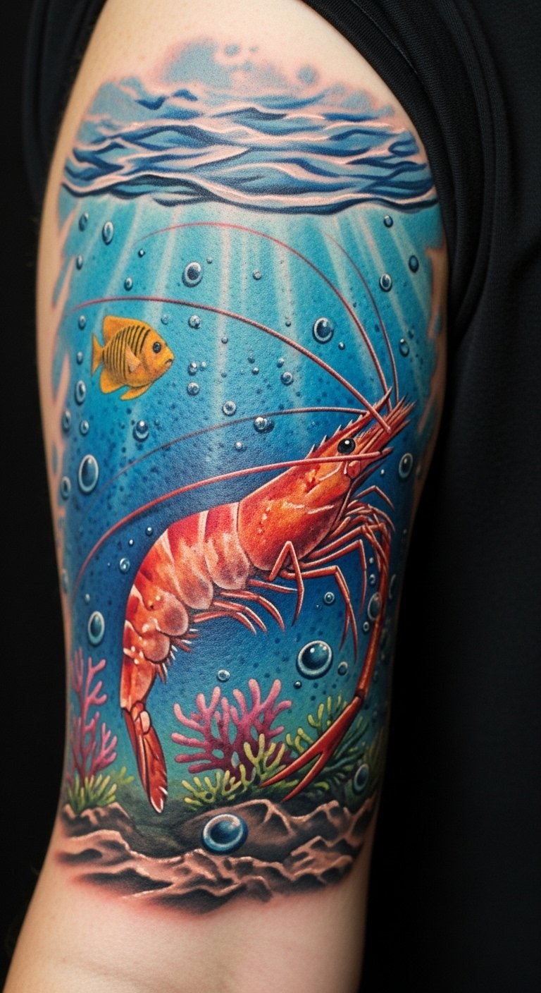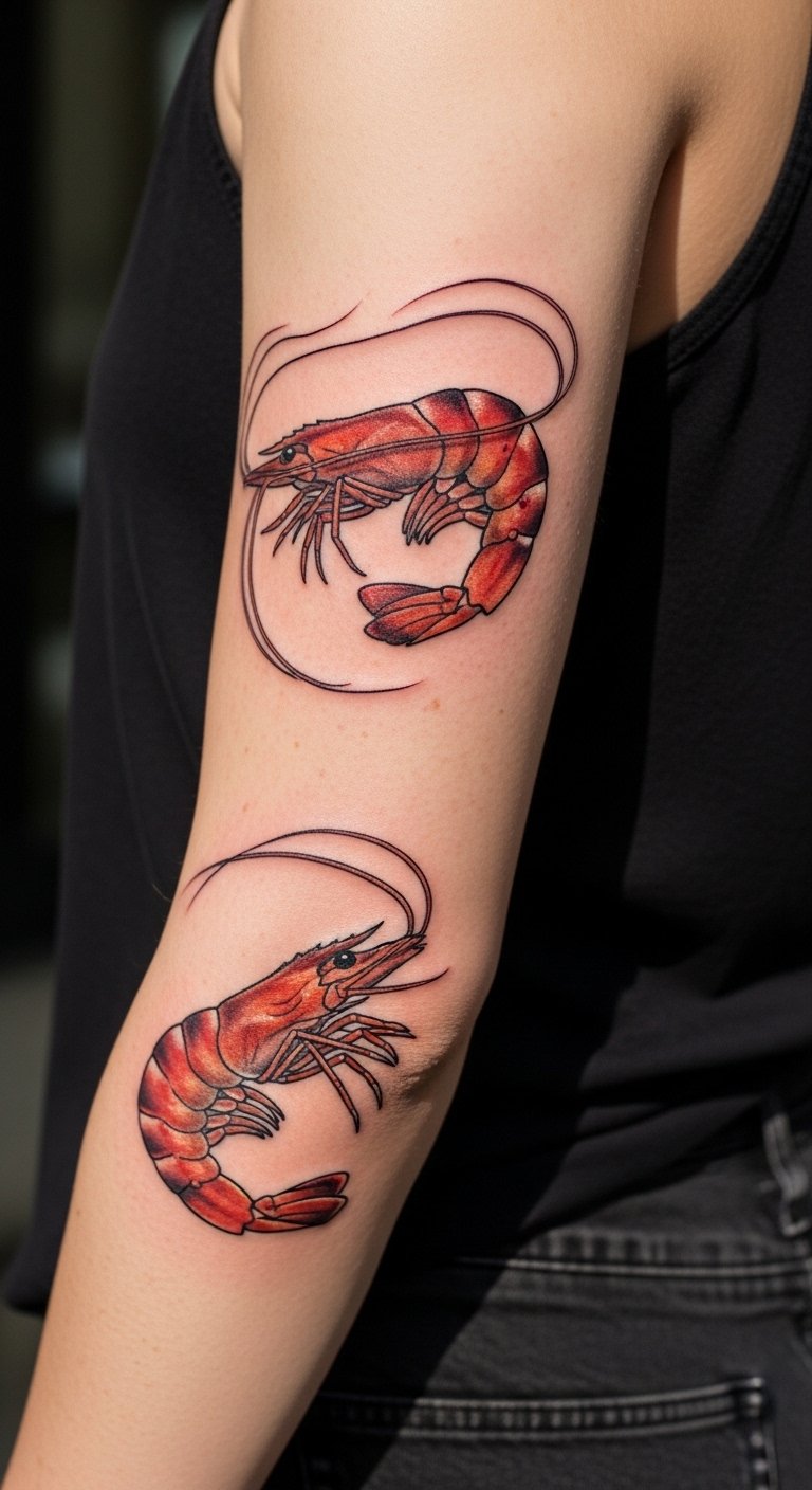 Honor the ocean. A marine tribute shrimp tattoo includes waves for awareness. Spot it on your arm. Draw sea scenes at home with crayons. It’s affordable and engaging. Use ocean-themed stickers for practice, $5. This supports conservation. Ink it for $110. Add a personal element.