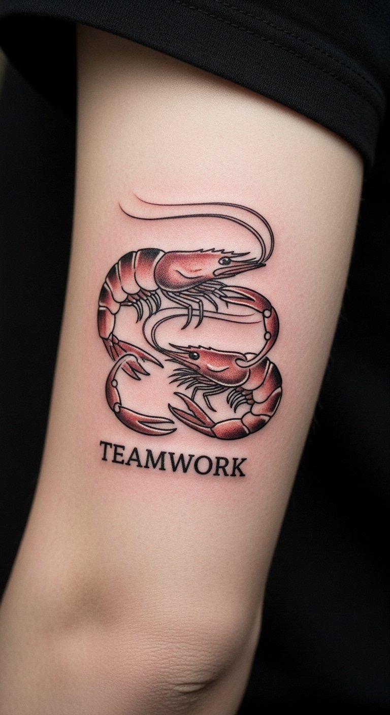 Foster bonds. A teamwork shrimp tattoo links shrimp for unity. Try your arm. Sketch teams at home. It’s bonding. Use group drawings. Emphasize collaboration. Get it for $80.