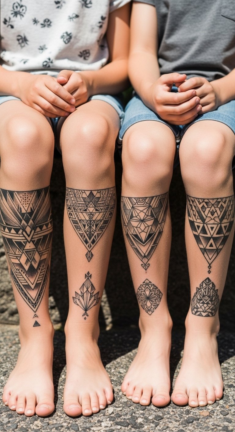 Geometric shapes fit any sibling pair. Draw triangles or squares. Customize simply. Expect $55. Local artist lists. Free shape tools. Place on legs. Test with stencils. Plan as equals. These tattoos unite. Keep costs low.