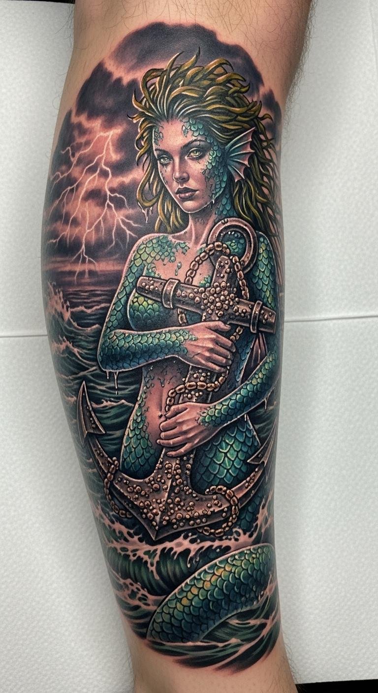 Burst colors around the siren. This design uses bright hues. Mix paints for color tests. Find color palettes online free. Ask for basic colors in sessions. Start with reds and blues. Thigh offers space for vibrancy. Experiment with shades yourself. Make it lively on a budget.