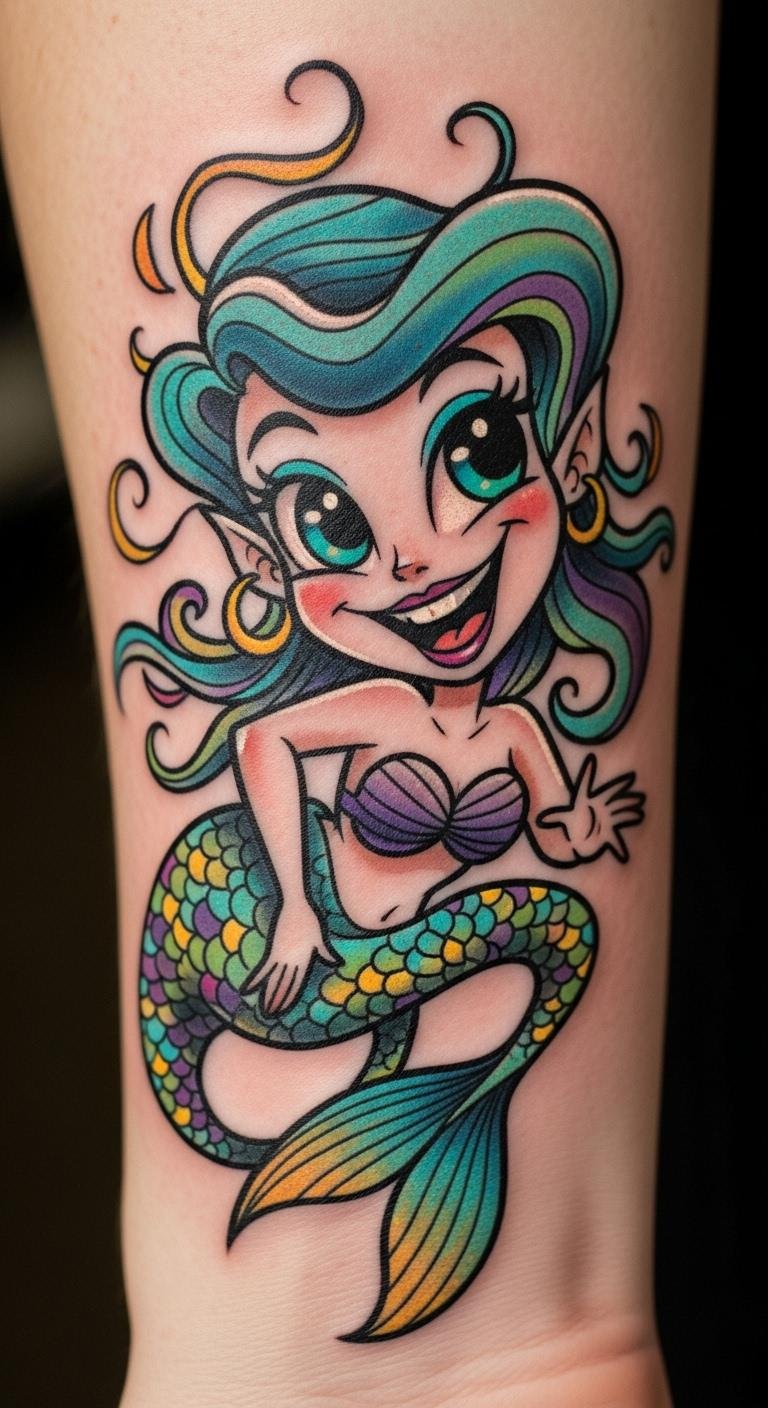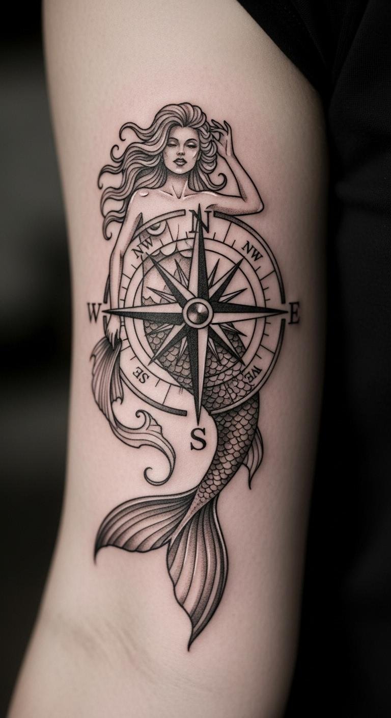 Picture a siren wrapped in waves. This design shows her form flowing with the sea. Start with a simple sketch on paper. Use free online tools to draw your version. Find a local artist for under $100 if you hunt for deals. Keep lines bold and colors bright for impact. Mix in personal touches like a favorite wave pattern. Think about black ink first to save money. This setup works great on arms. Get inspired and try tracing designs at home with a pen. You will see how easy tweaks make it yours.
