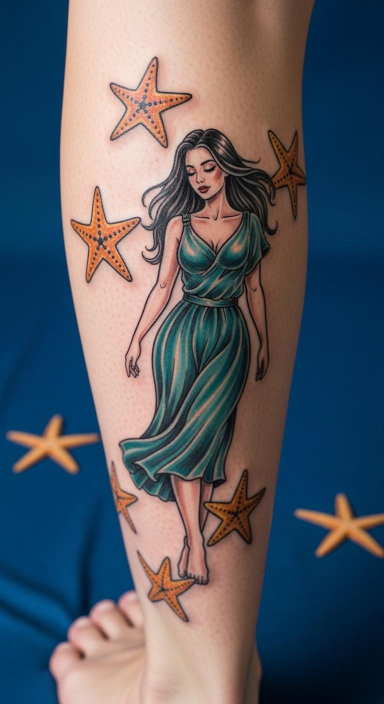 Accent with starfish for ocean feel. This design spots them on her. Use real starfish for reference. Free ocean graphics help. Choose a few to cut costs. Texture them simply. Calf position suits movement. Draw stars yourself. Ocean theme on the cheap.