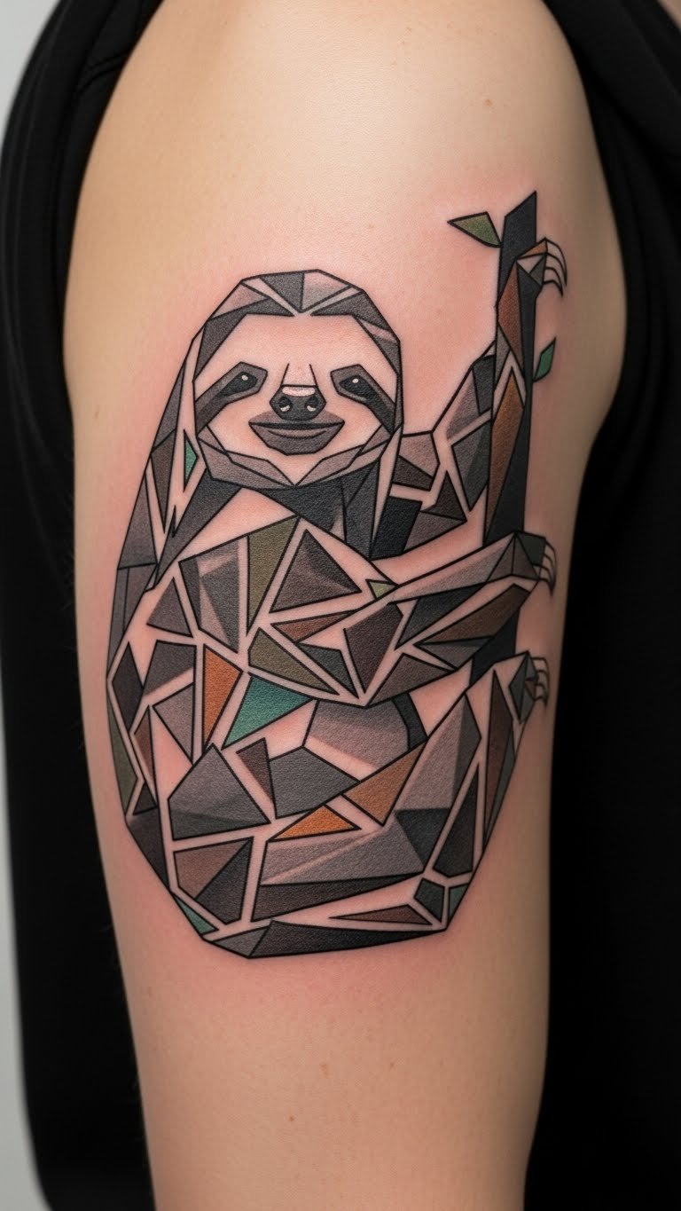 A geometric sloth tattoo brings a fresh, abstract vibe to your skin. Shapes like triangles and circles outline the sloth, making it ideal for fans of clean art. Grab a ruler and markers for less than $10 to draw your own version at home. Experiment on paper first to see how patterns fit your body. Place it on your side torso for a balanced look. Use online templates from free sites to tweak designs quickly. Geometric sloth adds a modern twist that’s easy to personalize. Stick to black ink if you’re starting out to keep costs low. This method helps you visualize without professional help right away. Once ready, find an affordable artist through social media. It’s a simple step to make your tattoo unique.