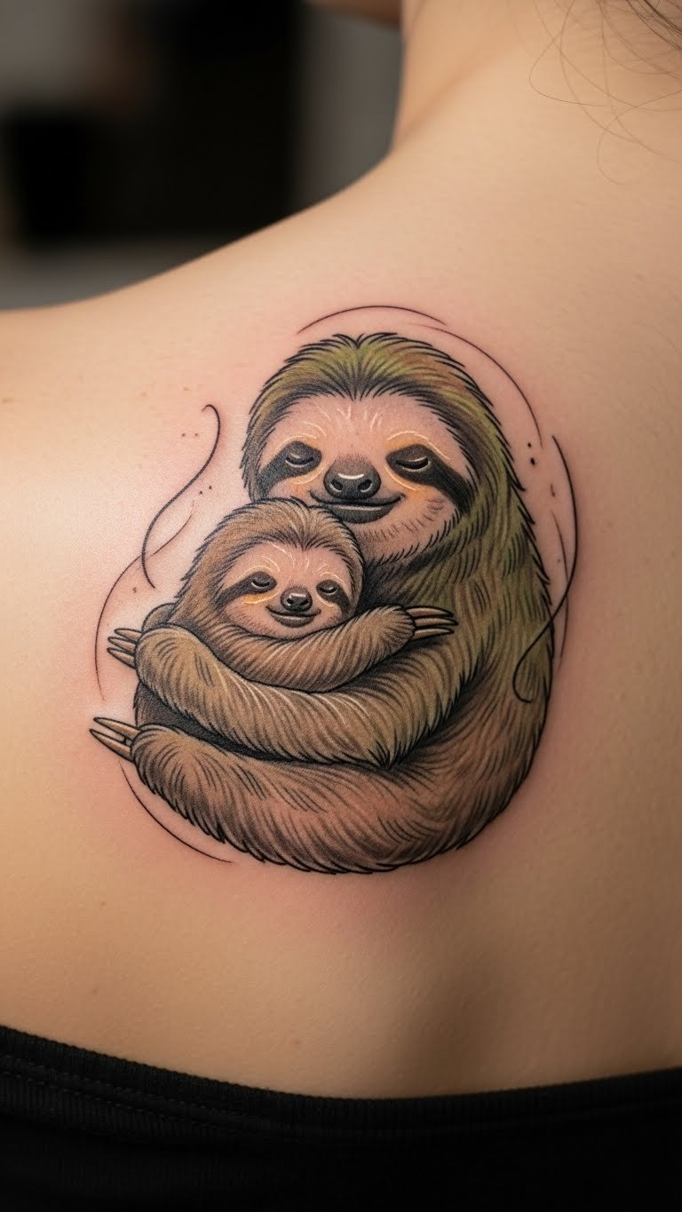 A mom and baby sloth tattoo highlights family bonds in a sweet way. The design shows a mother sloth holding her young, perfect for parents. Sketch it quickly at home using a cheap notebook and pencil. Adjust the size to fit spots like your back. Free stencil apps help refine the image fast. Mom and baby sloth carries emotional weight that’s hard to beat. Use basic lines to keep it affordable. This DIY step lets you plan without pressure. Once set, visit a nearby parlor for the final touch. It’s a practical choice for meaningful ink.