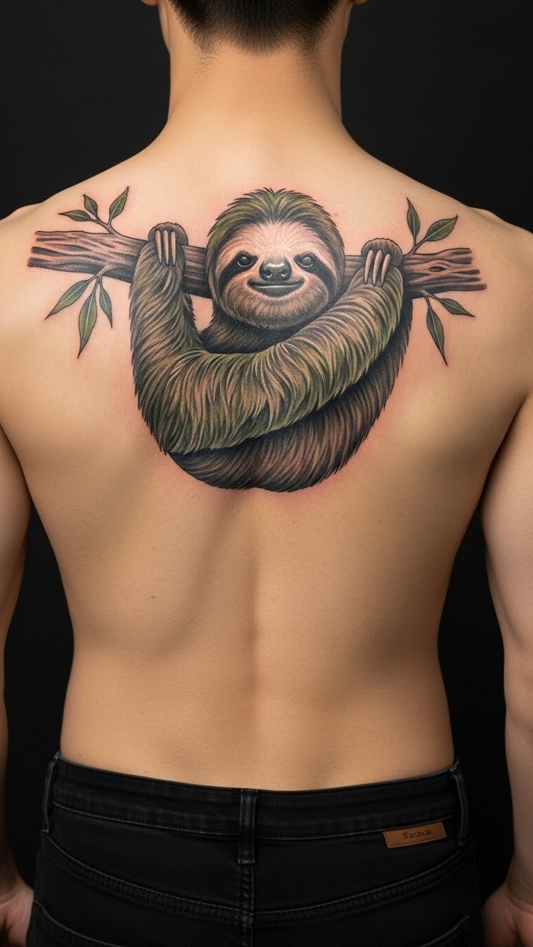 Back placement for sloth tattoos allows big ideas. Center it for balance. Sketch on a large paper. Use the back for elaborate designs. Free templates online aid. Back placement gives room. Keep it straightforward for savings. DIY first for confidence.