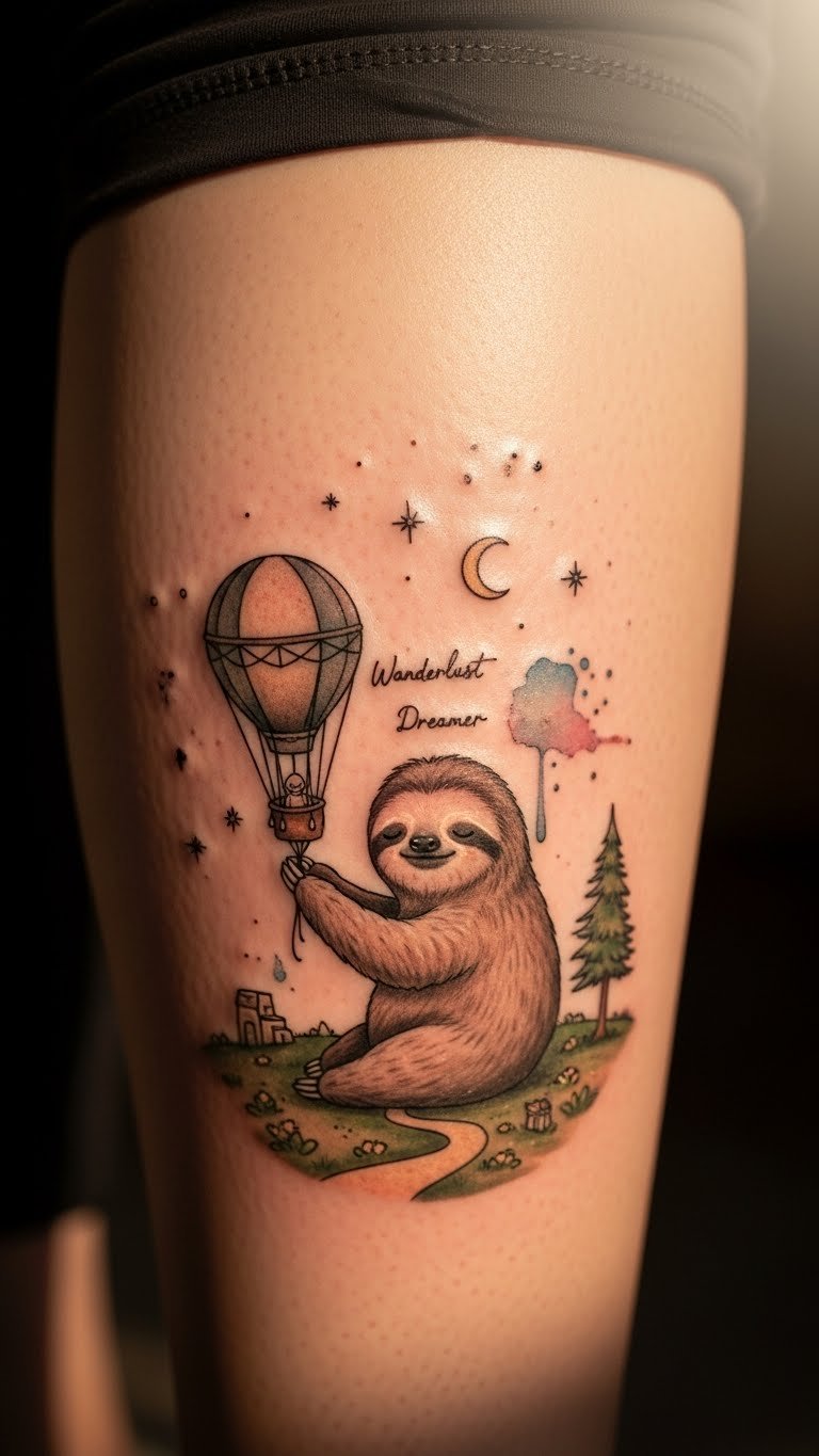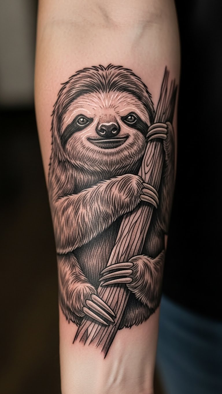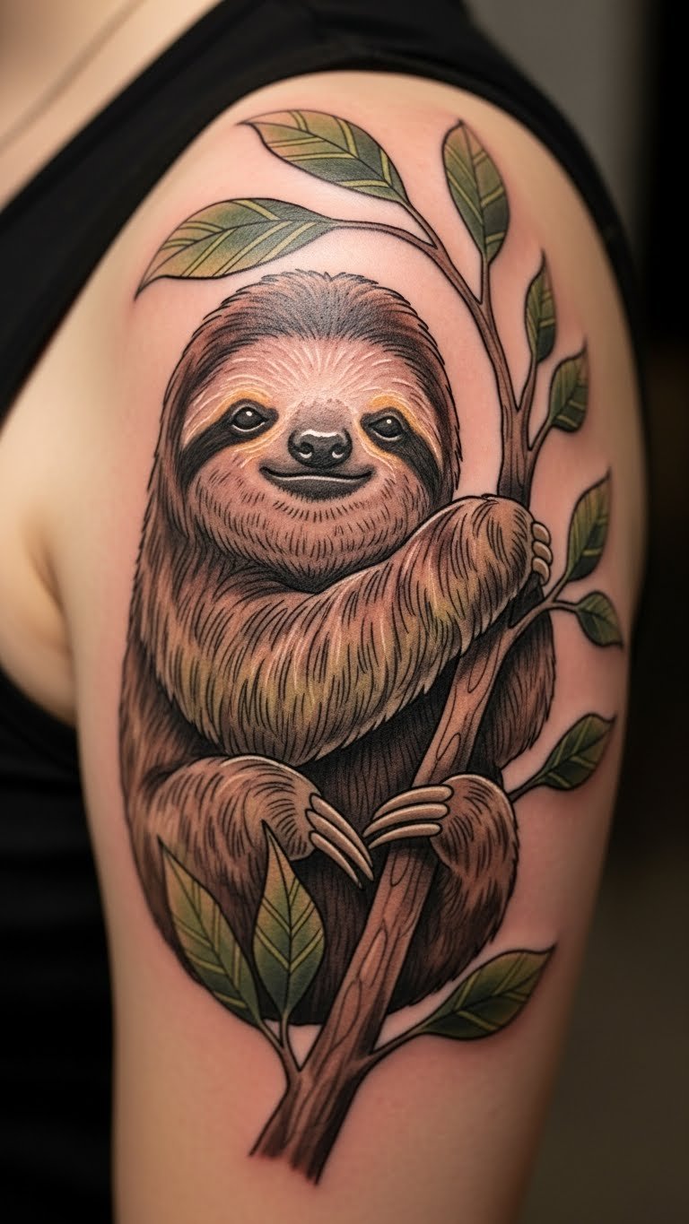 A nature-inspired sloth tattoo adds greenery for depth. Include leaves around the sloth. Sketch with garden leaves as reference. Place on your shoulder for flow. Free nature apps provide inspiration. Nature-inspired sloth enhances the theme. Stick to earth tones for budget reasons. DIY planning makes it straightforward.