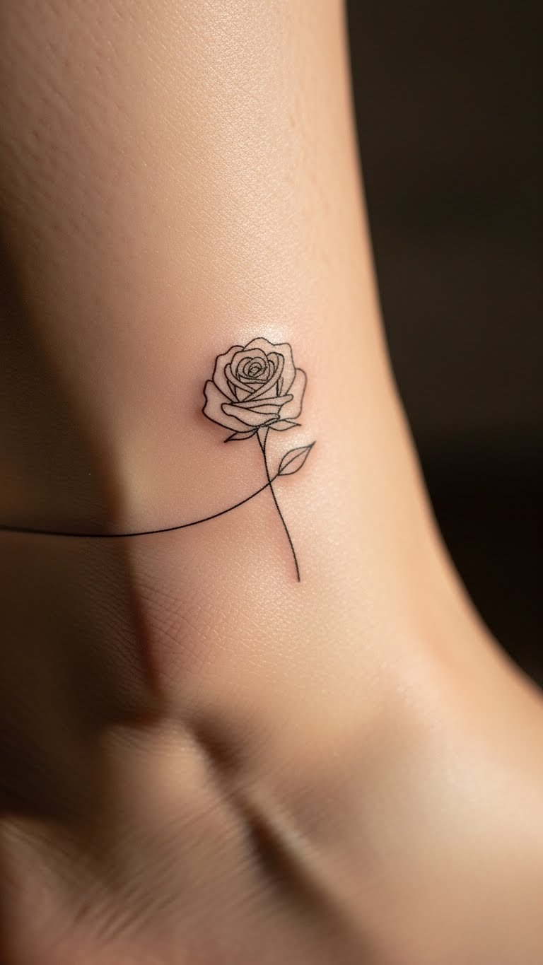 A small rose tattoo on your ankle keeps things simple and sweet. Think of it as a tiny nod to beauty in your daily routine. Pick a fine-line style for that effortless look. Start with a sketch on paper to see how it flows. For budget tips, use free online tattoo design apps to experiment before visiting an artist. Go for black ink if you’re new to this. Keep the size under 2 inches to avoid crowding. Add a pop of color with red petals for a fresh twist. This design works well with sandals or sneakers. Pair it with ankle jewelry for extra charm. Remember to moisturize the area after getting inked. Choose an artist who specializes in small work—check their portfolio online first.