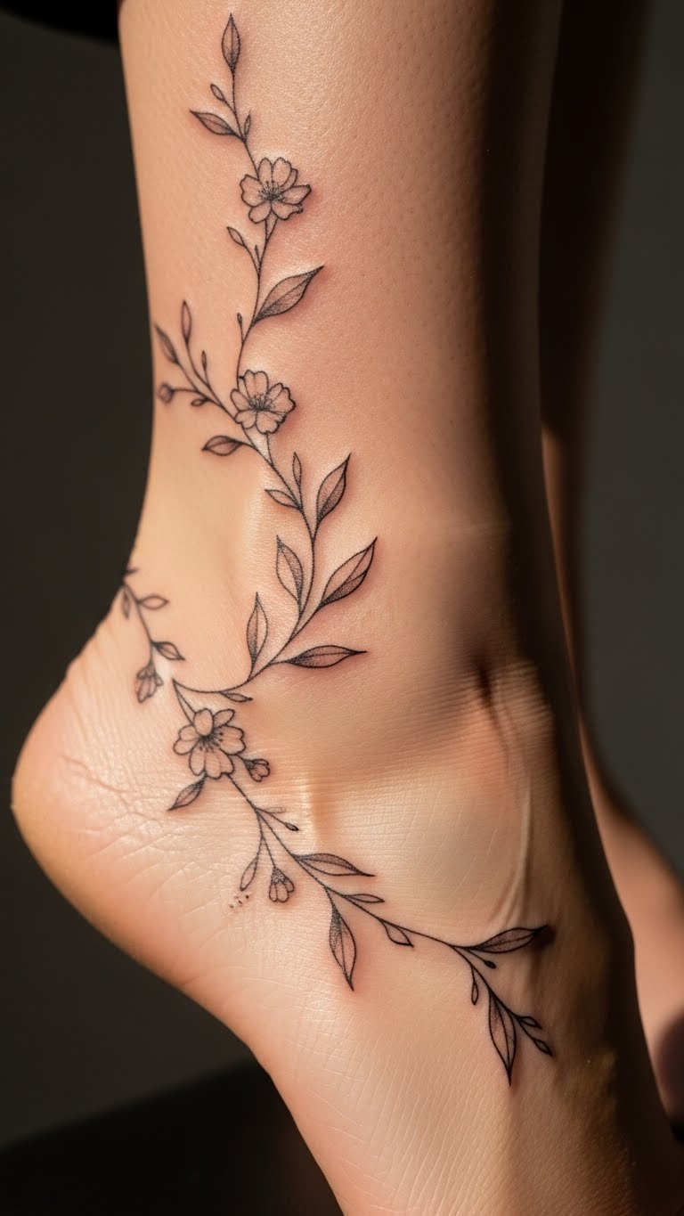 A floral vine tattoo winds gracefully around your ankle. Let it trail naturally along the curve. Use a vine sticker to test the layout. Download floral patterns for free online. Stick to fine lines for delicacy. Size it to wrap without overlapping. Incorporate small blooms for interest. This complements dresses or pants. Apply sunscreen to preserve colors. Find affordable options through community groups. Pair with nature-inspired jewelry.