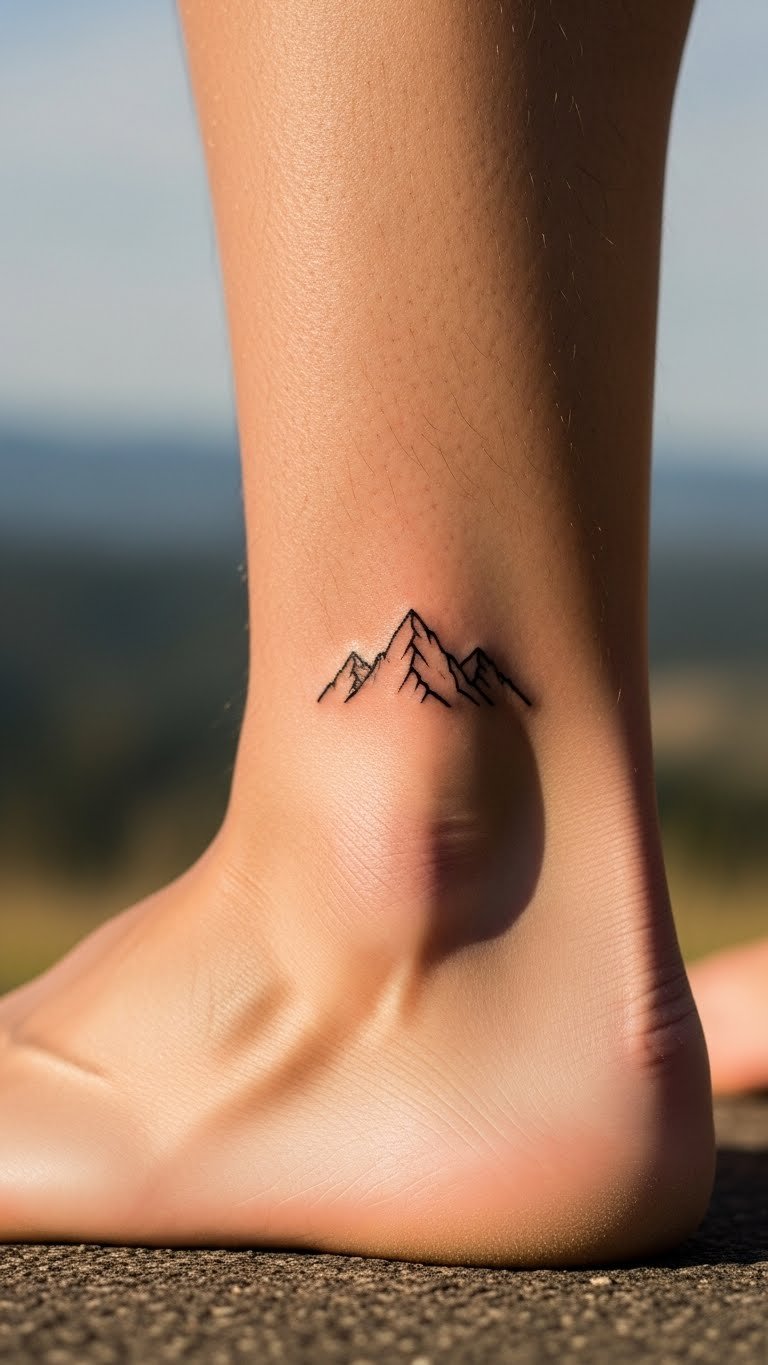 A mountain peak tattoo stands for strength. Set it along the ankle’s curve. Outline peaks with a ruler. Get free mountain templates. Stick to basic lines. Make it compact. This fits outdoor looks. Care with simple routines. Find budget artists online. Layer with adventure gear.