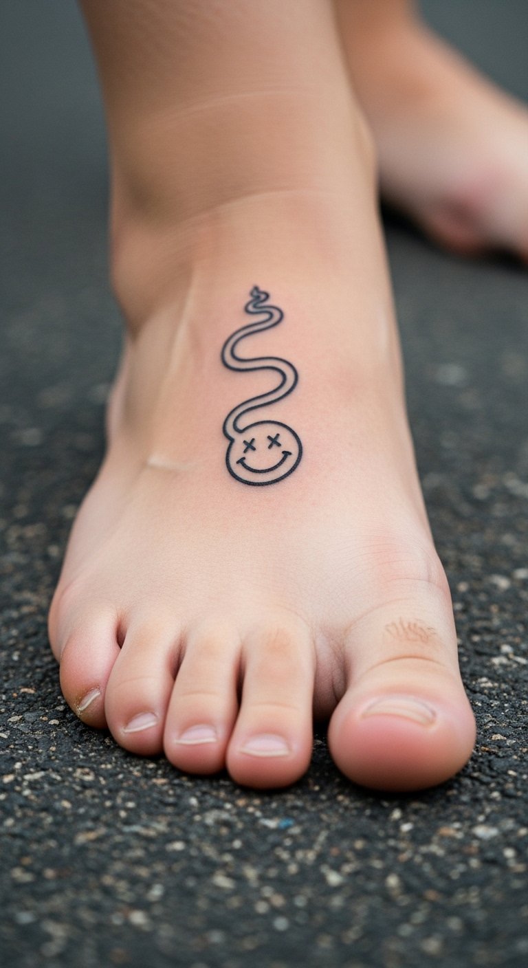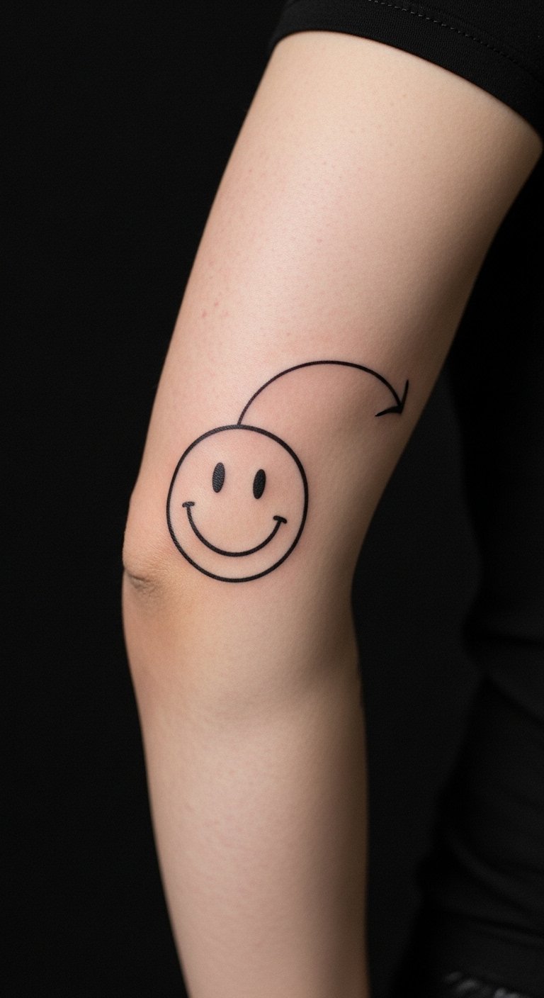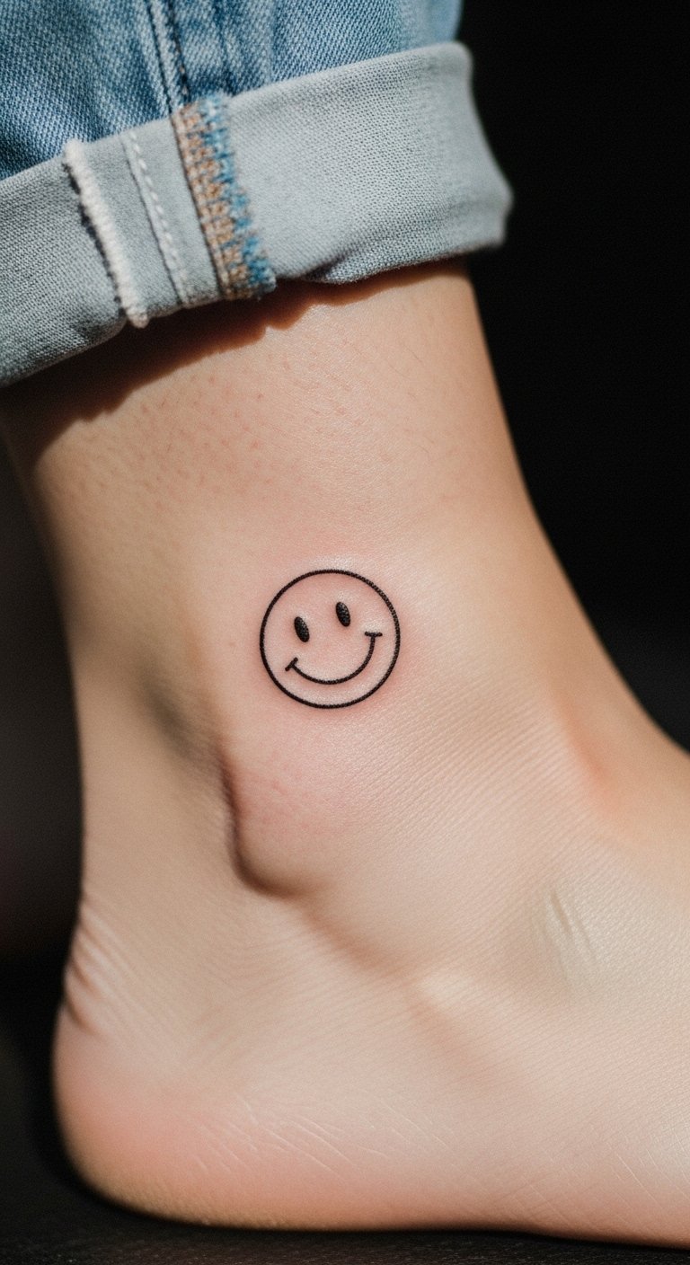 Go for a minimalist line smiley if you like clean looks. It uses just a few strokes for a big impact. Place it on your ankle to stay hidden or show off. Expect to pay $60 for something basic. Cut costs by drawing it yourself on paper first. Grab a ruler and pen to make straight lines. Practice on your hand with washable ink. This works as a quick DIY with a marker. Wear sneakers to protect it while it heals. Use it as a reminder during walks. Keep your design plain. Add it to your routine without hassle. See how it brightens tough days.