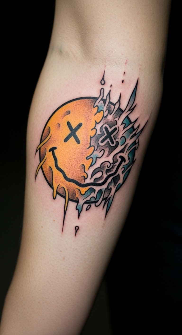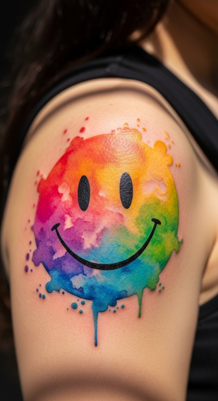 A watercolor smiley splash adds soft colors to your arm. It looks like paint on canvas. Put it on your shoulder for a personal touch. Prices start at $80 for colors. Save by mixing your own shades at home. Draw a base smiley and blend watercolors on paper. Test with face paints on your skin. This DIY takes minutes with art supplies. Show it off with tank tops. Let it remind you of sunny days. Keep the process fun. No need for extras. Just try it once.