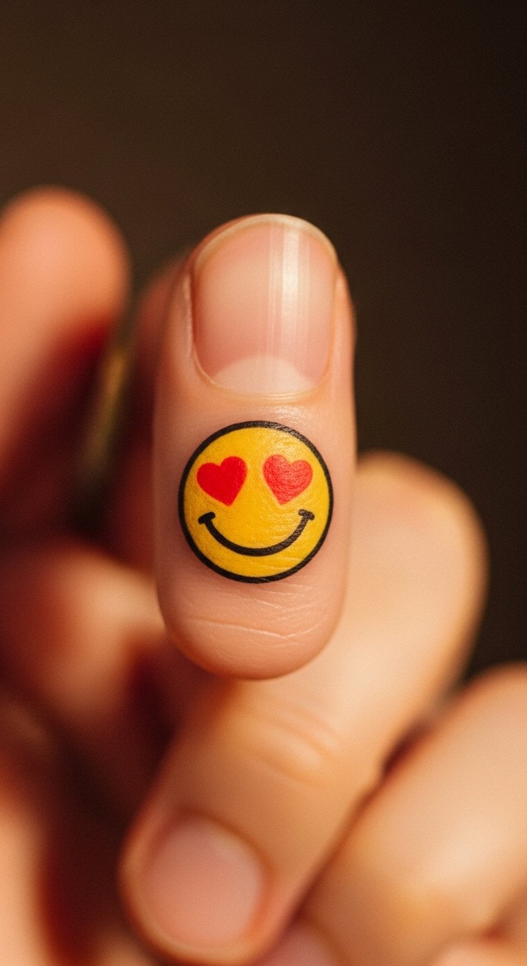 Add heart eyes to a smiley for extra love. It fits perfectly on a finger. This small tweak makes it cute. You might spend $70 total. Go cheap by drawing hearts around a smiley face on paper. Use stickers for a quick mock-up. Try nail art pens for a temporary version. Wear rings over it for style. Let it show affection in daily life. Keep designs heartfelt. Do this at home easily. Just add hearts to your sketch.