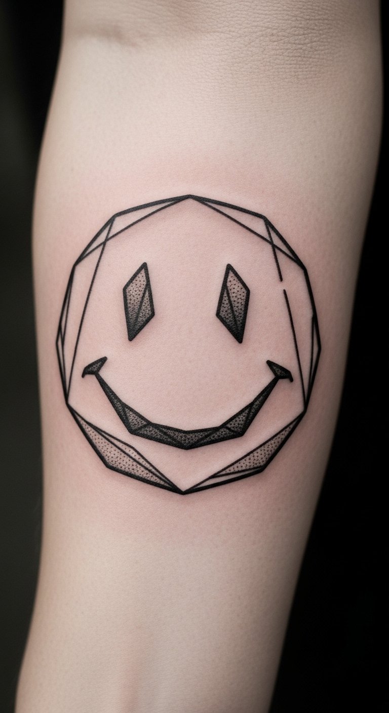 A geometric smiley pattern mixes shapes for modern flair. Place it on your forearm for visibility. It stands out with triangles and circles. Cost around $90. Sketch it freehand on paper first. Use a compass for perfect circles. Practice with string and pins for patterns. This DIY uses household items. Pair with long sleeves for cover. Use it to spark creativity. Keep it straightforward. Build your own version.