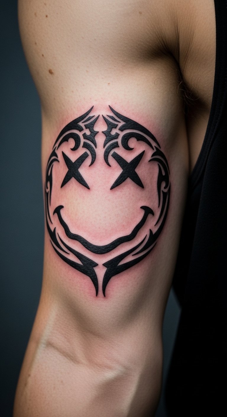 Give a smiley a tribal twist for edge. Put it on your bicep for strength. The patterns add cultural vibes. Expect $100. Draw simple lines on paper to start. Use markers for tribal effects. Test with body paint at home. Wear t-shirts to display it. Let it represent your story. Keep the idea basic. Make one yourself quickly.