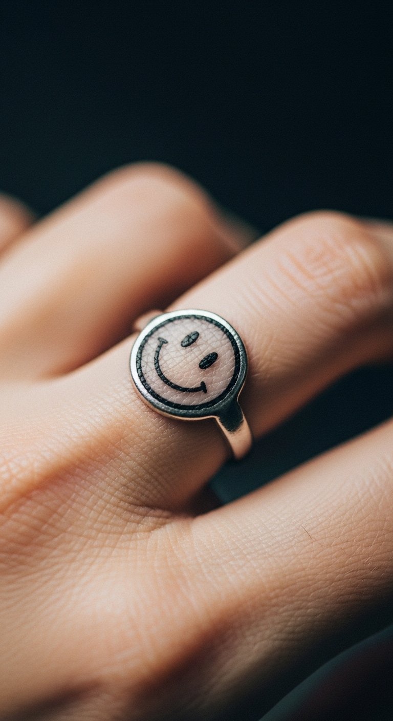 A finger smiley ring acts like jewelry. It wraps around your finger neatly. Great for constant reminders. Around $50. Trace a ring on paper first. Use string to measure your finger. Apply with temporary ink for fun. Wear gloves if needed. Let it brighten handshakes. Keep it minimal. Do a DIY in seconds.