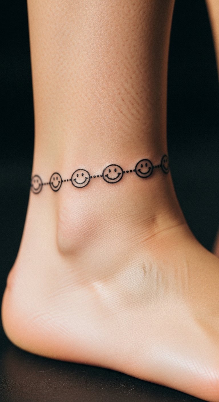 Chain smileys on your ankle for a linked look. It flows with your step. Easy to hide or show. Cost $60. Draw chains on paper simply. Connect dots with a pen. Use string art for practice. This home idea uses basic tools. Pair with socks for protection. Let it guide your walk. Keep designs flowing. Try it fast.