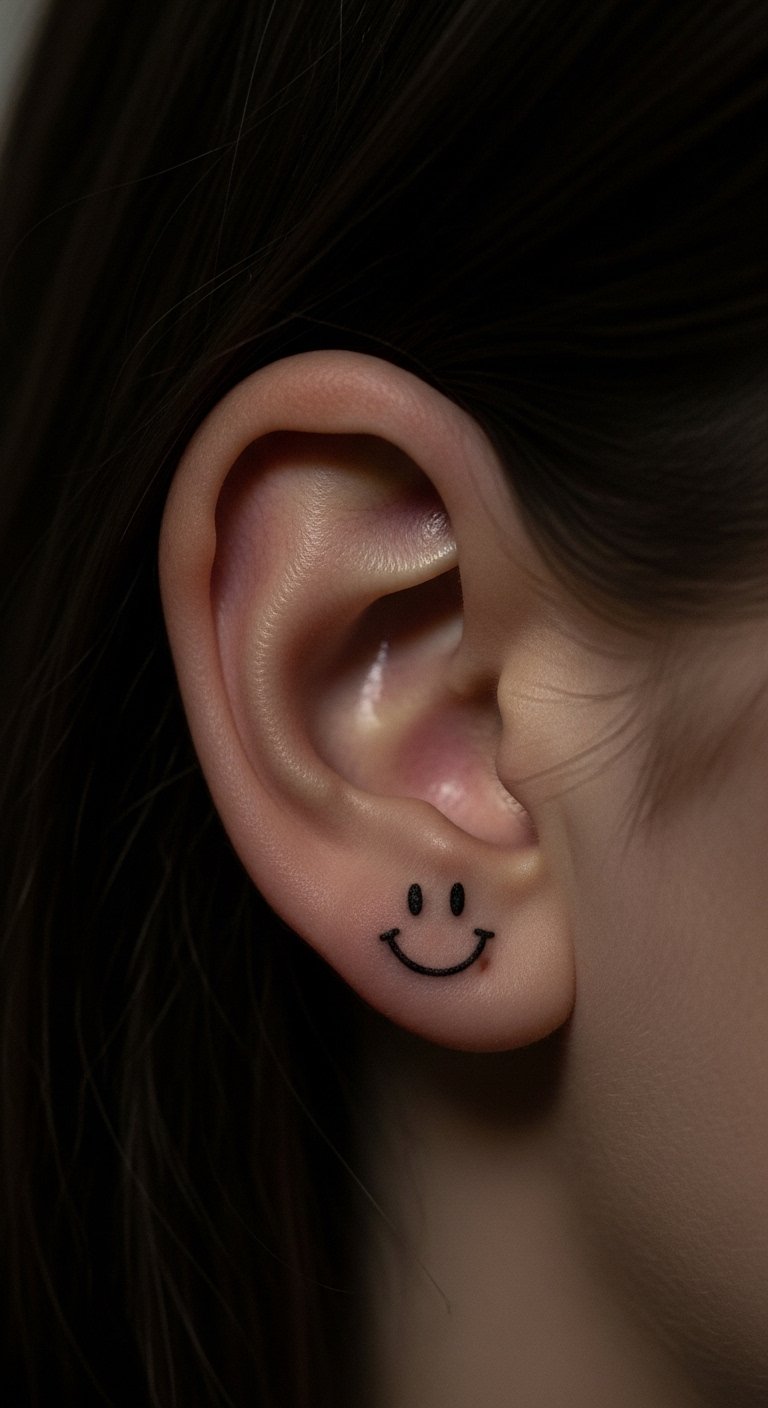 Hide a smiley behind your ear for surprise. It’s discreet yet fun. Perfect for first timers. About $55. Sketch it on your ear outline. Use a mirror for accuracy. Test with ear stickers. Wear hair up or down. Let it be your secret. Keep the process light. Do it yourself easily.