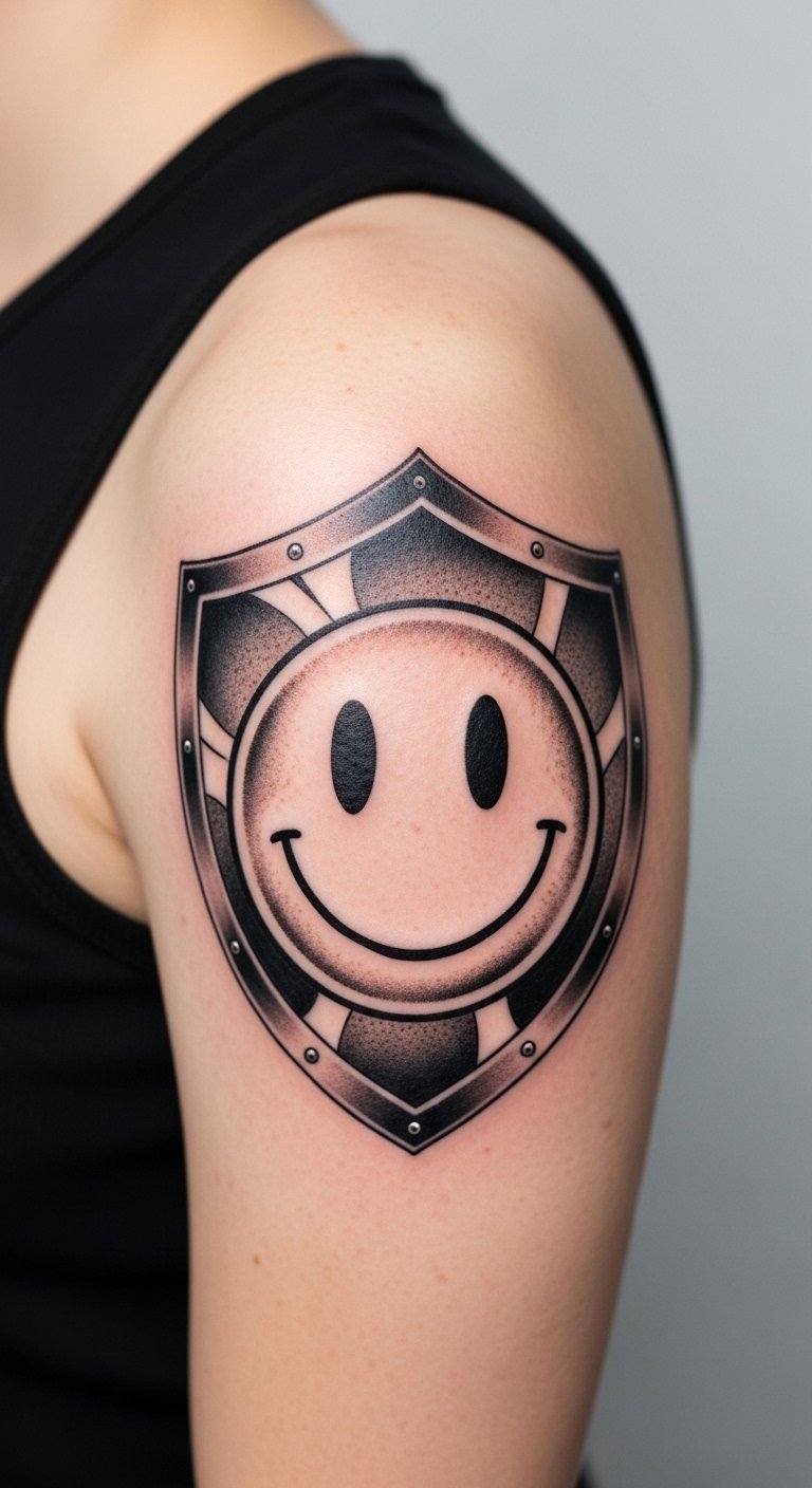 A shoulder smiley shield feels protective. Place it high for confidence. It wards off bad vibes. Around $85. Draw a shield shape on paper. Add a smiley inside. Practice with cardboard cutouts. This DIY needs little. Show it with open shirts. Let it boost your day. Keep it strong. Build one quick.