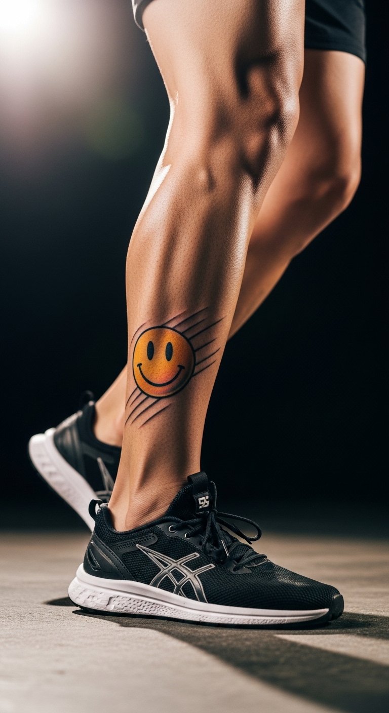 Stride with a leg smiley for energy. Place it on your calf. Boosts your walk. Around $75. Draw on leggings first. Use athletic tape for marks. Practice with leg bands. Wear pants for healing. Let it power your steps. Keep it lively. Do a simple version.