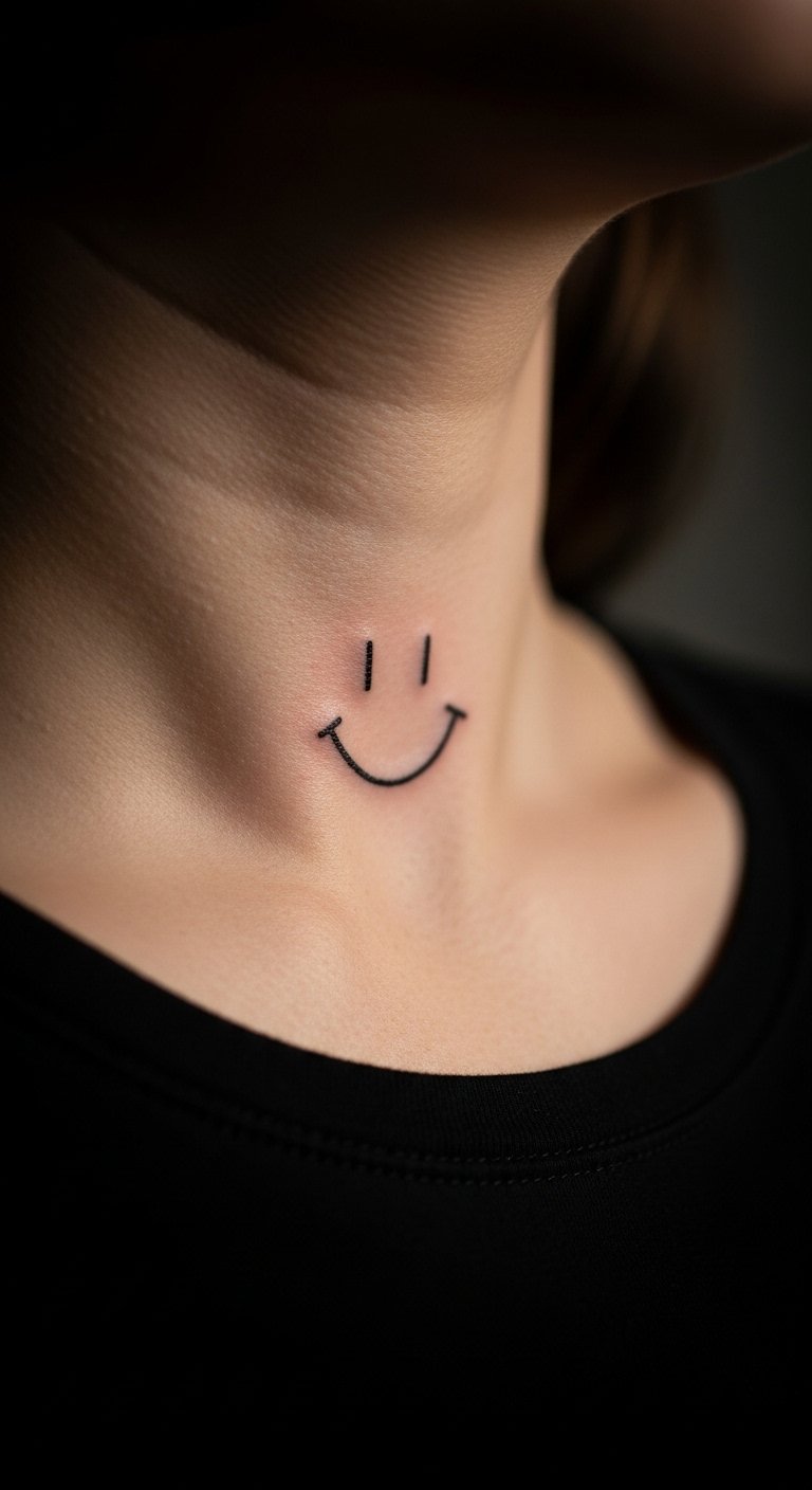 A neck smiley line is bold and quick. It sits high for notice. Adds edge. Cost $65. Trace on a scarf. Use necklaces for layout. Test with chokers. Wear collars if sensitive. Let it stand out. Keep lines clean. Make one fast.
