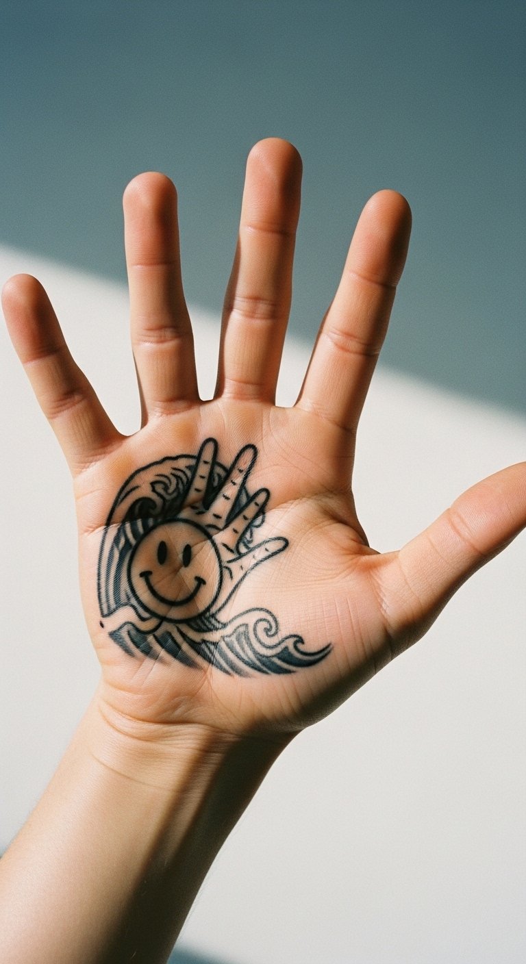 Wave with a hand smiley for greetings. It’s on your palm. Interactive. About $60. Outline on your hand. Use gloves for practice. Apply with hand creams. Wear rings beside it. Let it greet the world. Keep waves friendly. Try fast.