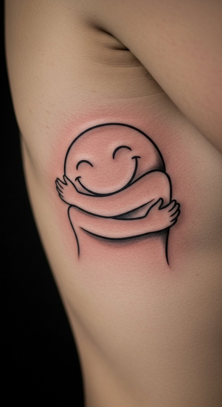 Hug a smiley on your ribs for closeness. It’s personal and warm. Comforting choice. About $100. Draw on rib cages. Use body wraps. Apply with safe paints. Wear loose clothes. Let it embrace you. Keep hugs tender. Try DIY.