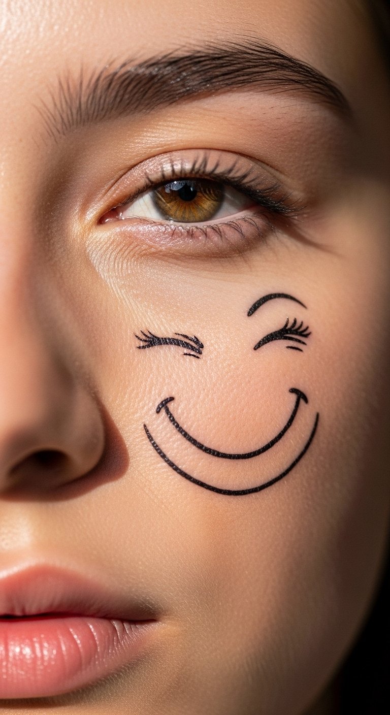 Wink with a face smiley as a temporary add. It’s not permanent. Playful idea. Around $20 for temp. Draw on your face. Use makeup for tests. Apply with face paints. Wash off easily. Let it wink joy. Keep it light. Try right away.