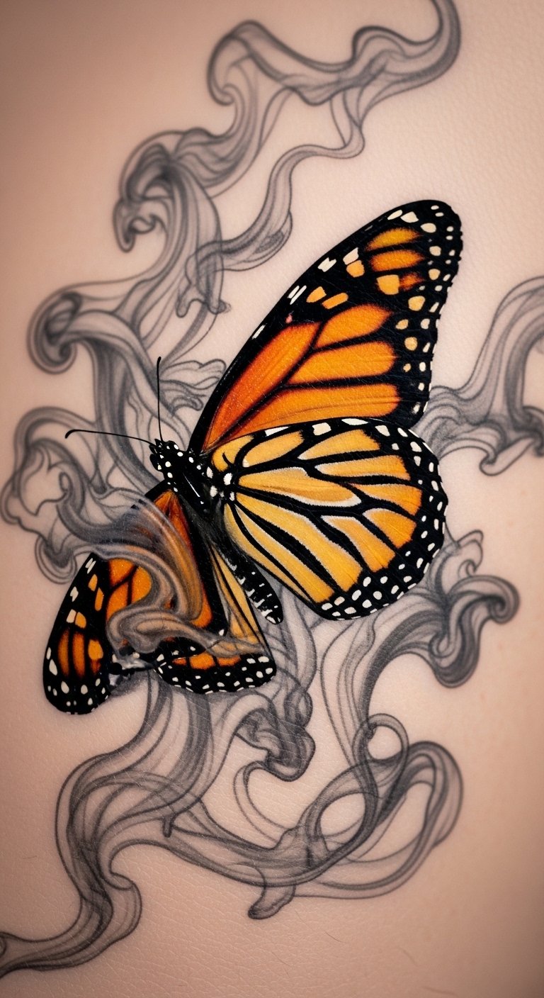 This design shows a butterfly rising from smoke, symbolizing change and growth in a simple way. Imagine delicate wings intertwined with misty lines for a fresh vibe.