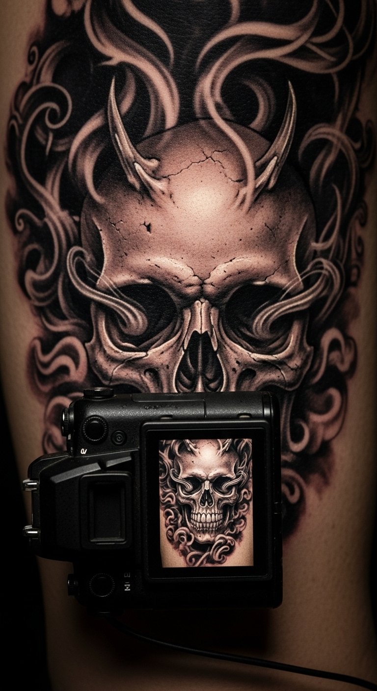 Go for a smoke skull that mixes edge with elegance, representing life’s fleeting moments. Think bold outlines fading into soft swirls for impact.