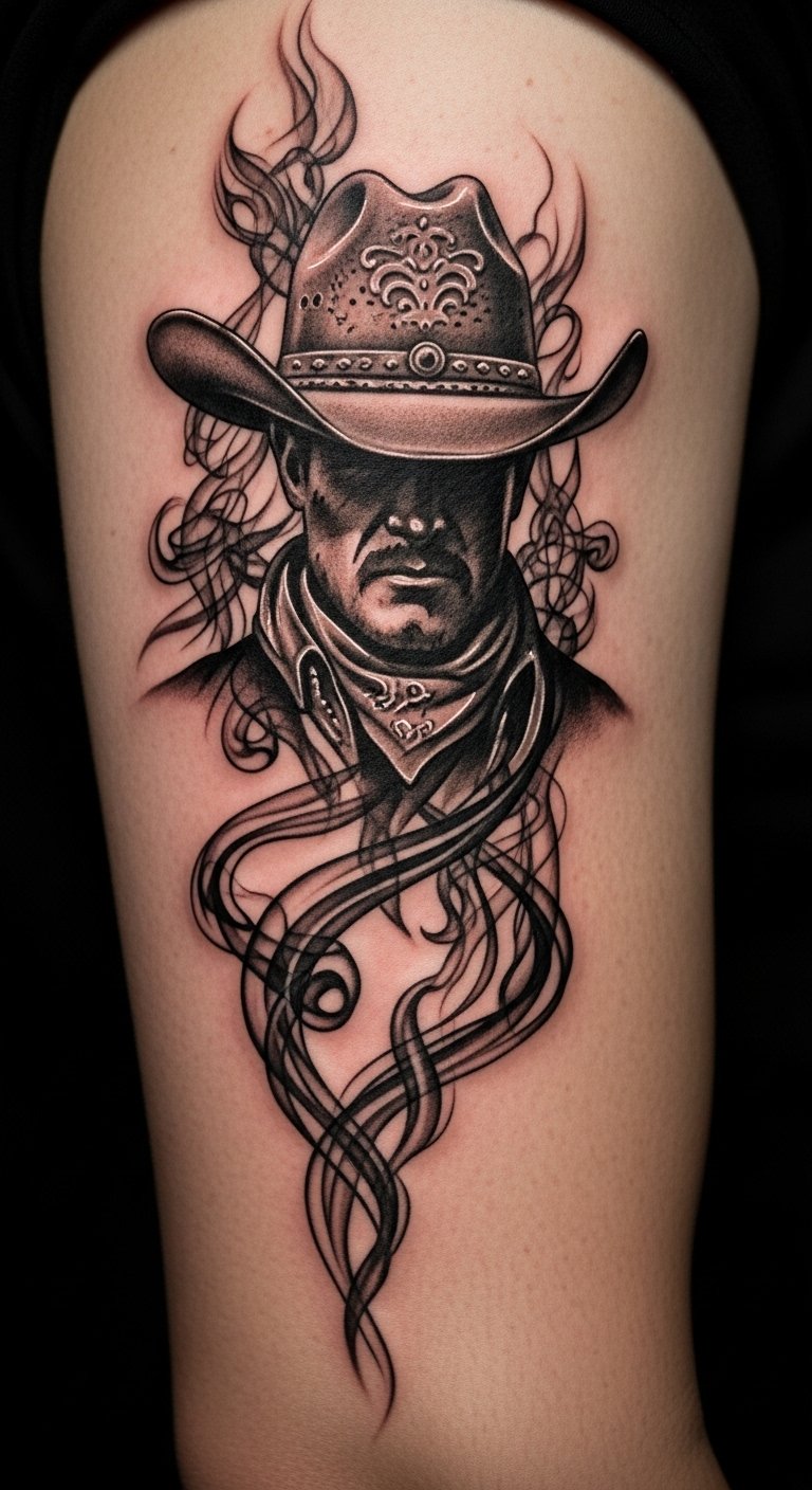 This cowboy smoke design brings a rugged story to life, with smoke trailing from a hat for that wild feel. Picture bold figures in gentle mists.