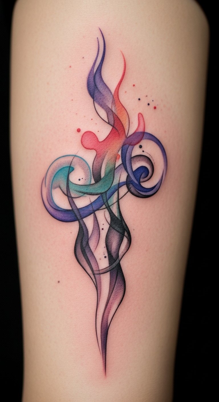 Create a full sleeve with flowing smoke patterns that feel alive and energetic. Envision vibrant hues merging into seamless waves for a dynamic look.