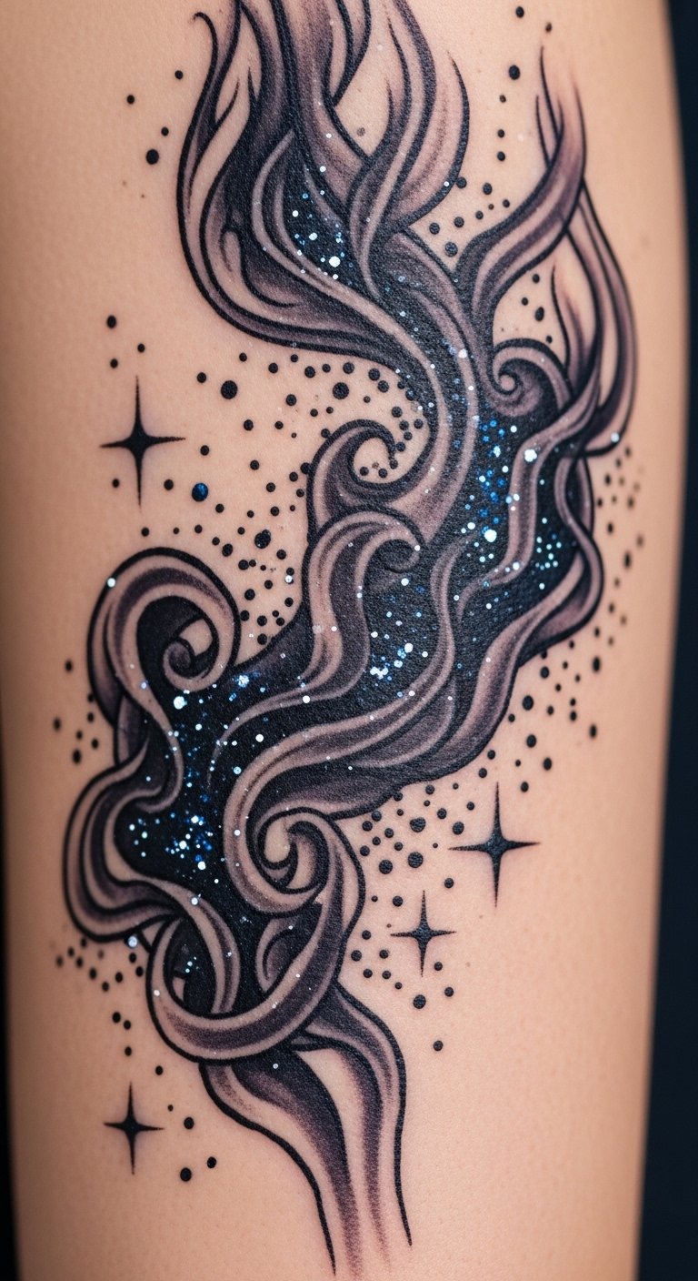 Incorporate stars in smoke for a cosmic feel, like stars born from clouds. Picture tiny lights in flowing patterns.