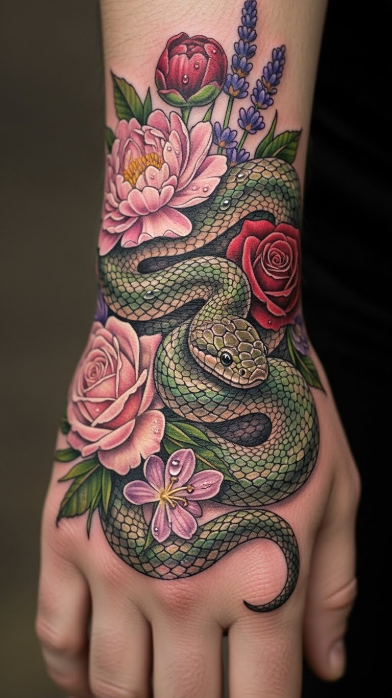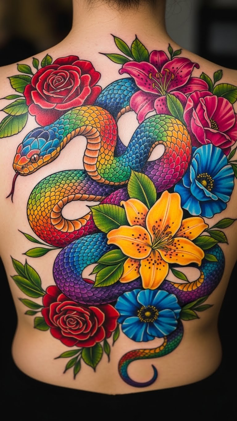 Vibrant colors make snake and flower tattoos pop with energy. Picture a colorful snake amid bright flowers. It lifts your spirit. Use free apps to color designs. Tip: Start with crayons for fun tests. DIY: Draw and color a small version on paper. Choose colors that reflect you.