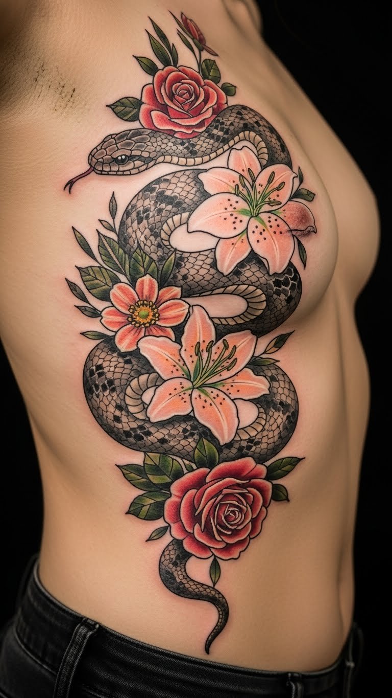 Ribs offer a hidden canvas for snake and flower tattoos. Envision a snake weaving through flowers on your side. It represents inner change. Draw ideas at home with minimal supplies. Free apps provide templates. Budget tip: Reuse scrap paper for your drawings. Simple DIY: Outline on paper and hold it up to a mirror. This spot keeps it personal and powerful.