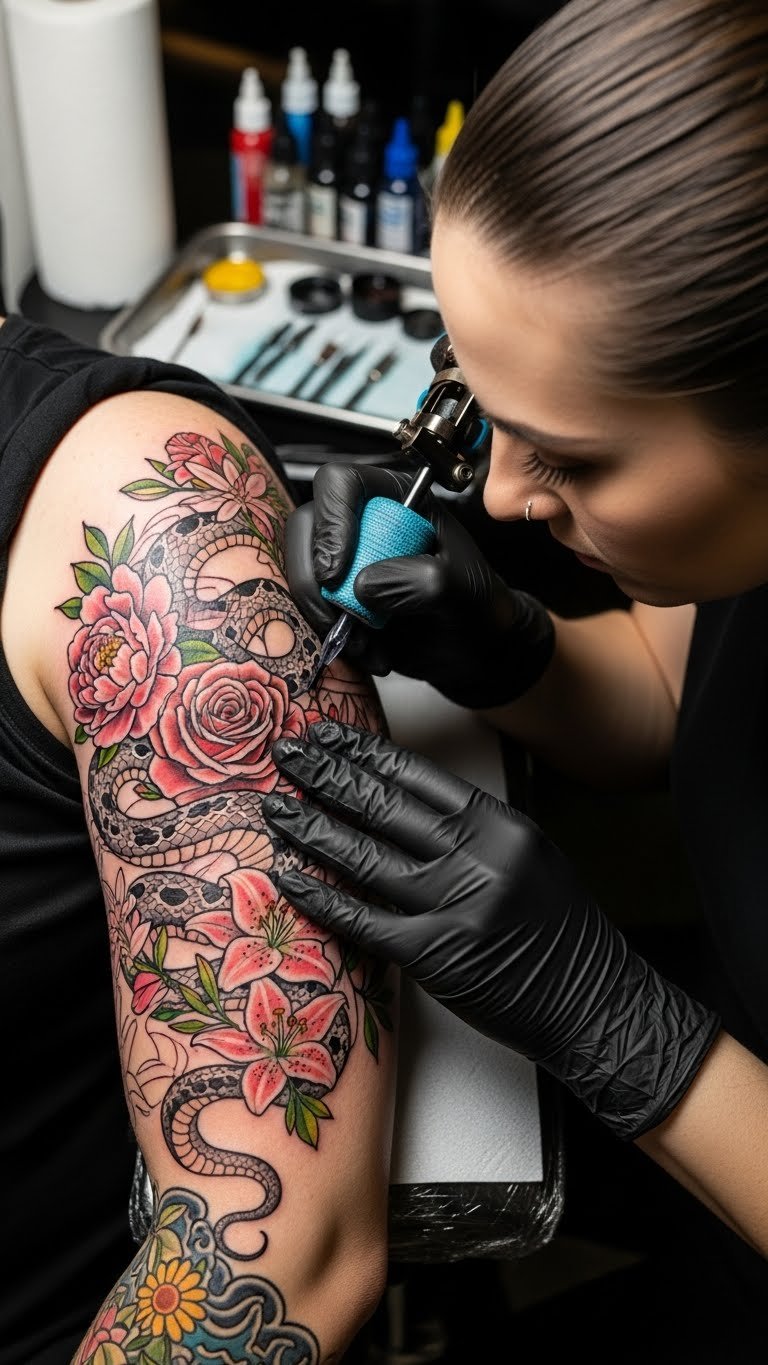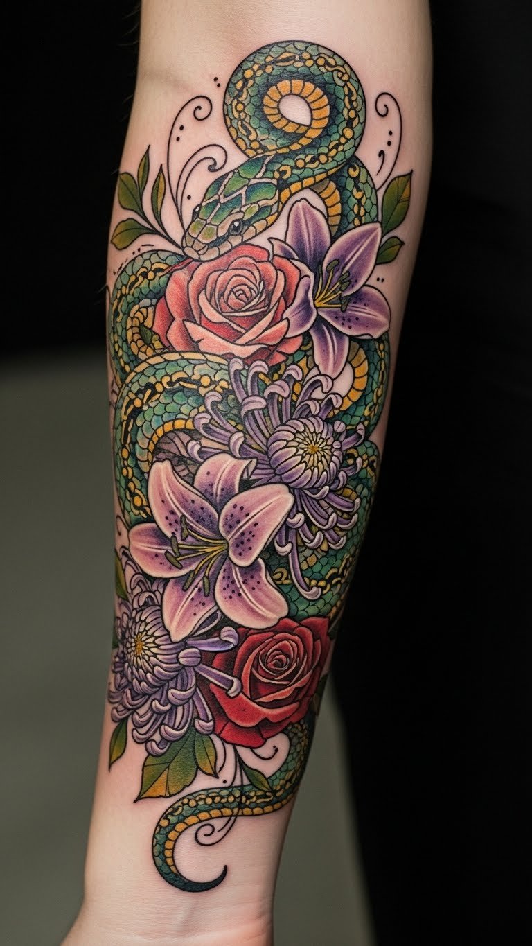 Arm placement lets snake tattoos show off with flowers in motion. Imagine a snake coiling down your arm with blooms along the way. It feels empowering. Plan with free drawing software on your phone. Save money by: Tracing designs from books you already own. Easy DIY: Draw the outline on your arm with a temporary marker. This spot makes it visible and meaningful. Take small steps to make it your own.