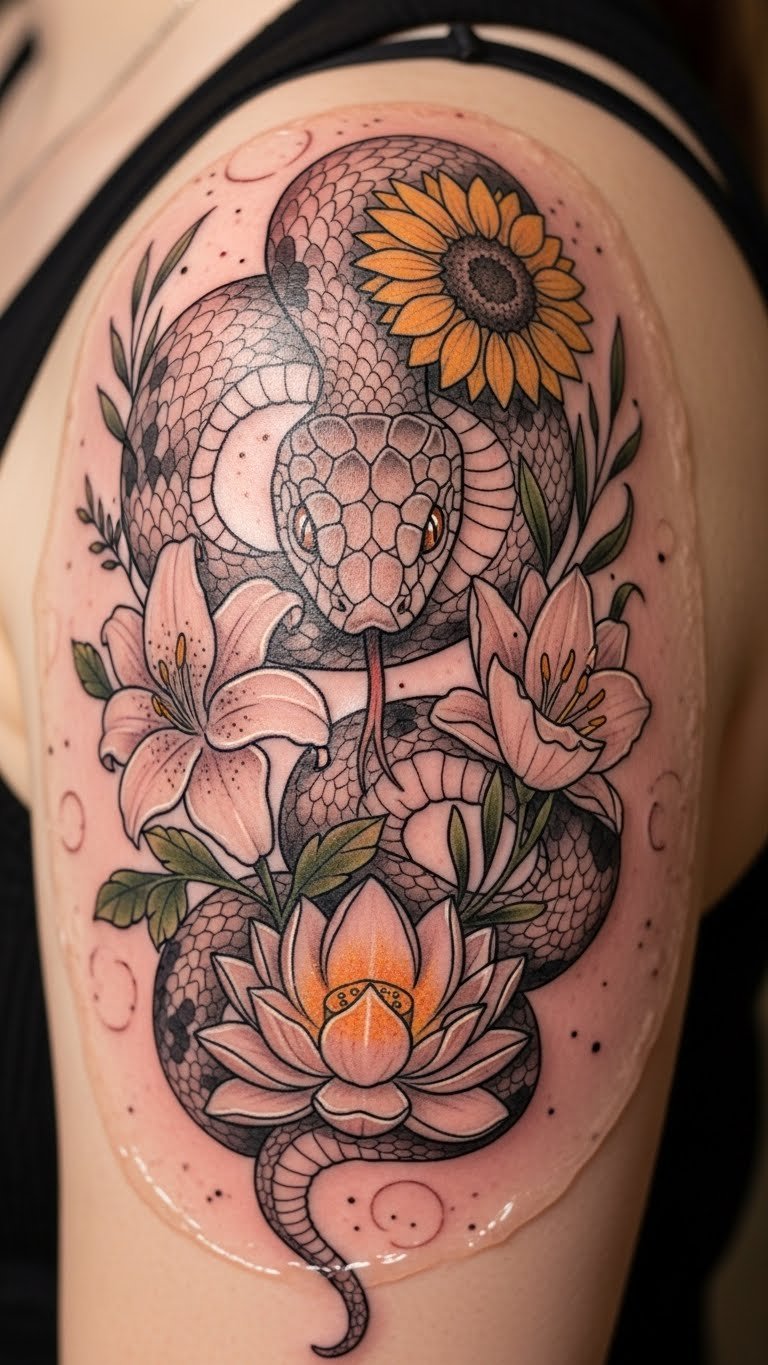 Shoulder tattoos place snakes and flowers in a strong, visible spot. Picture a snake peeking from flowers on your shoulder. It symbolizes protection. Sketch quickly with paper and a pencil. Online resources are free and helpful. Tip: Add a flower that means something to you. DIY idea: Use fabric markers on a shirt to test the look. This placement boosts your confidence daily.